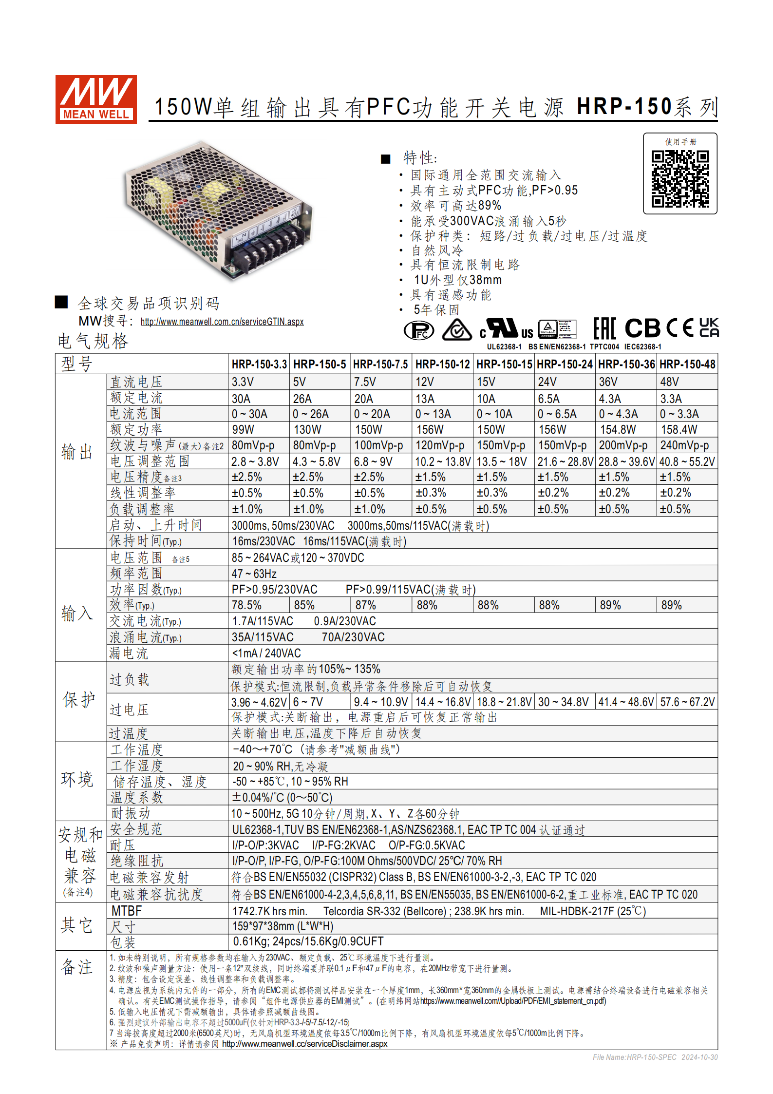 功率等級:150W(部分型號略高,如 HRP-150-48 達 158.4W)