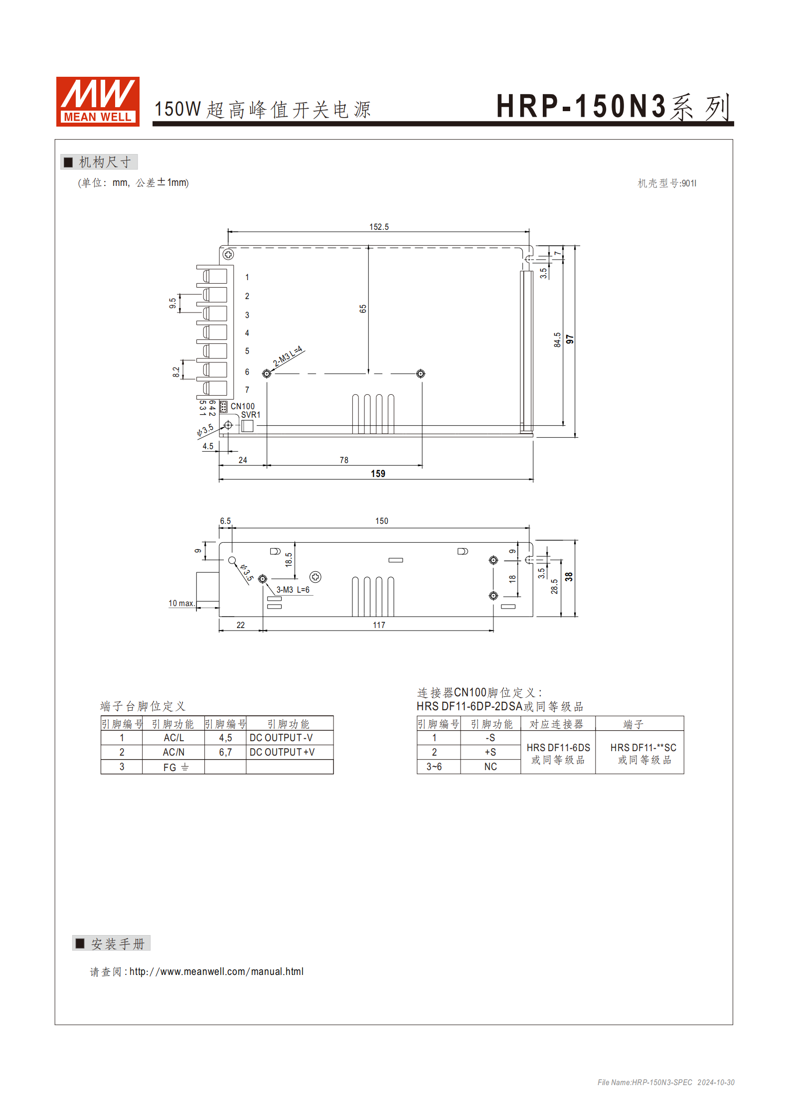 | HRP-150N3-24 | 24V | 6.5A | 156W | 150mVp-p | 21.6~28.8V |