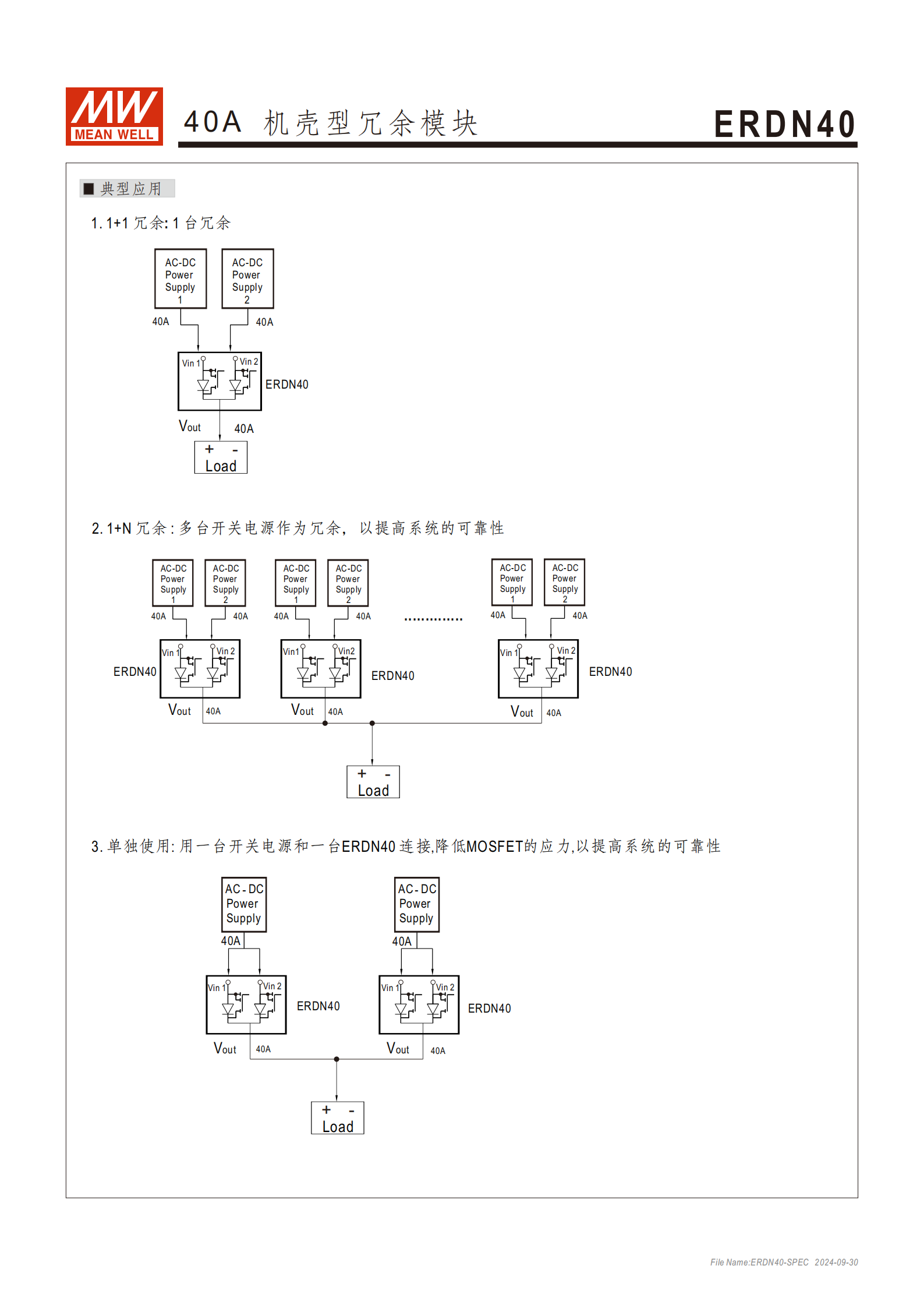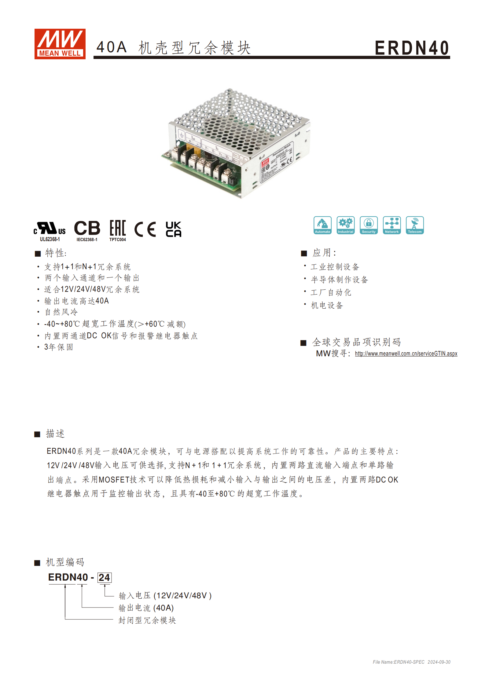 產(chǎn)品名稱:40A 機(jī)殼型冗余模塊(型號(hào):ERDN40)