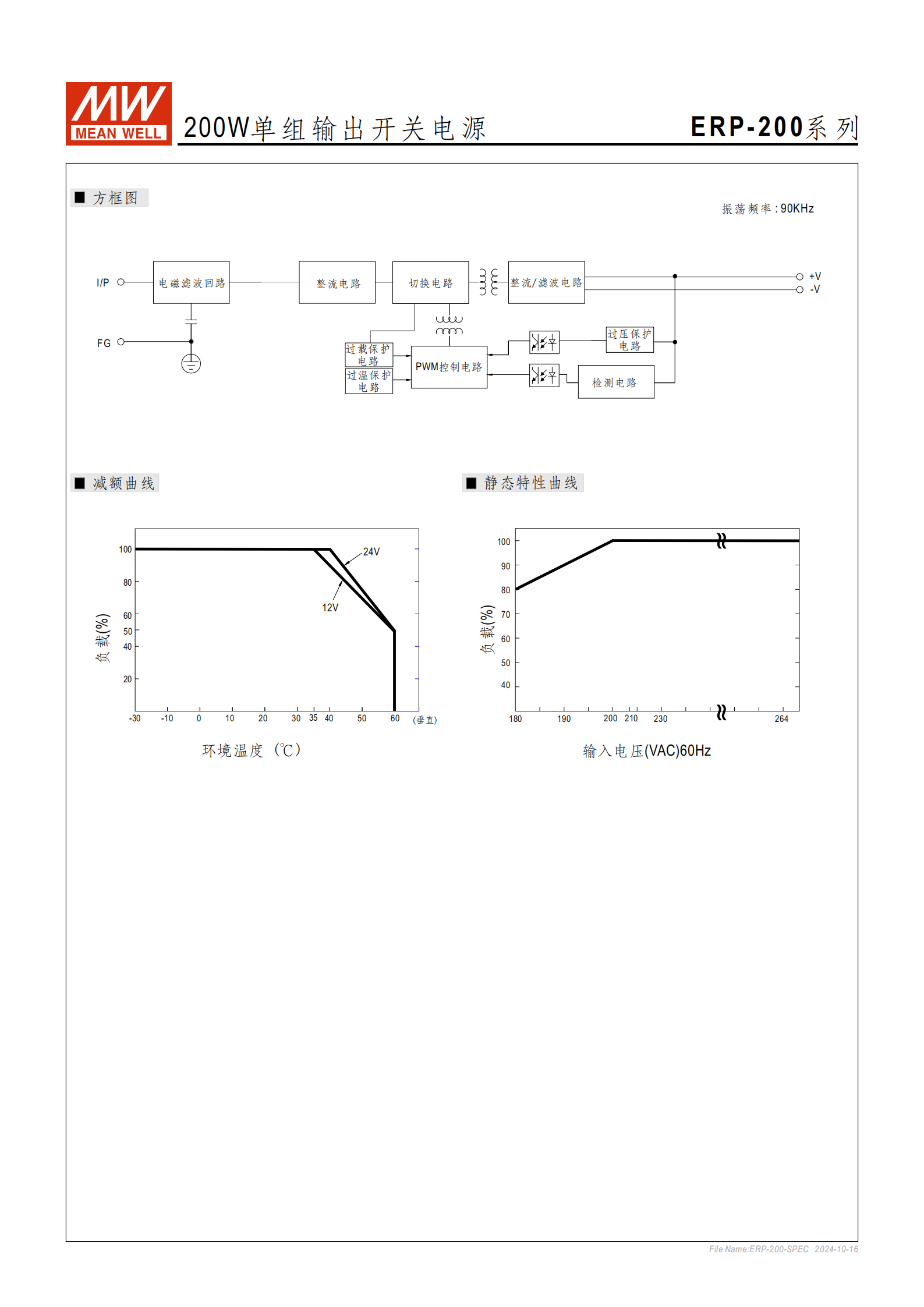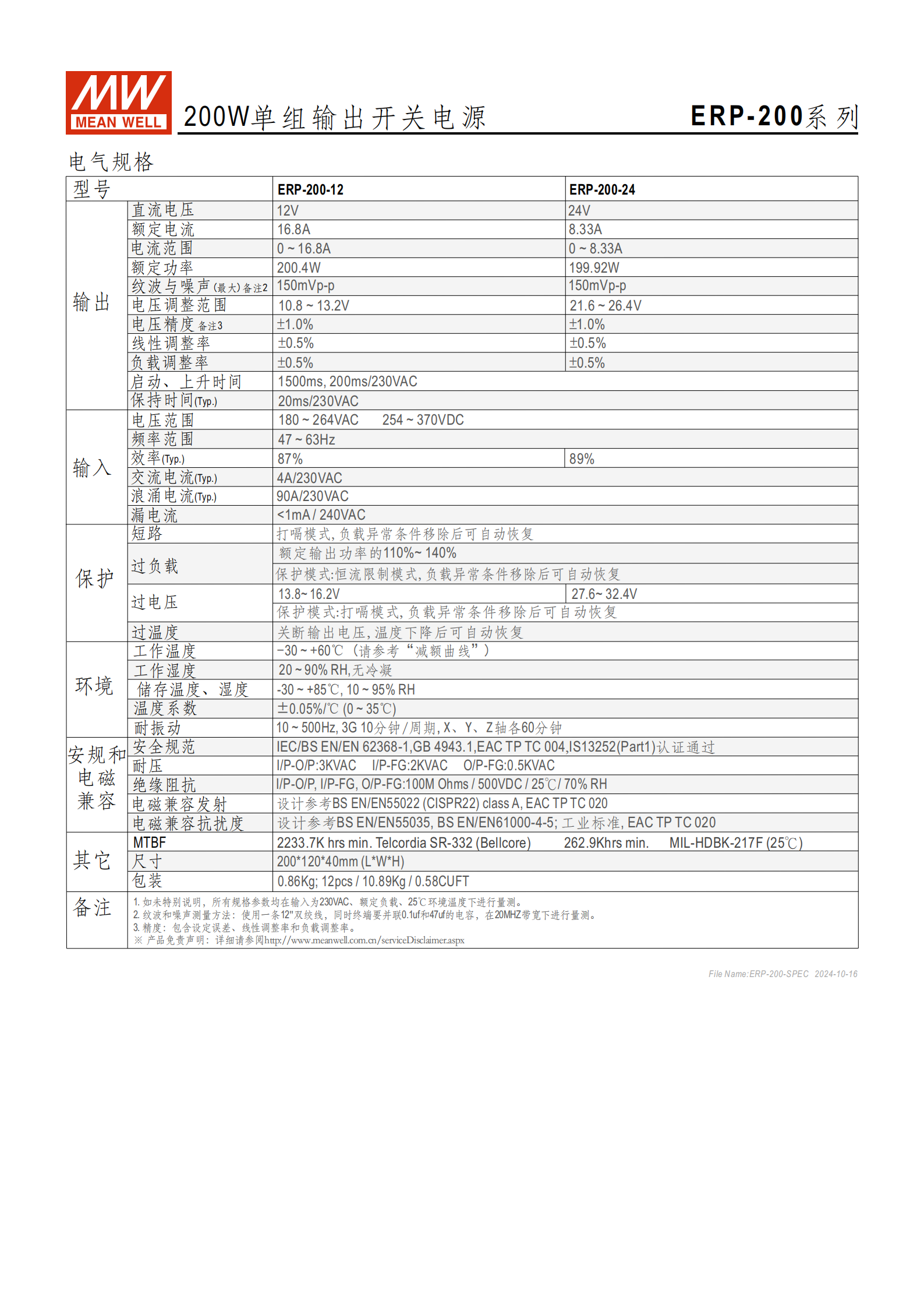 | 輸出 | 型號(hào): ERP-200-12, -24 額定功率: 200.4W (12V) / 199.92W (24V) 額定電流: 16.8A (12V) / 8.33A (24V) 電壓精度: ±1.0% 紋波噪聲: 150mVp-p (最大) |