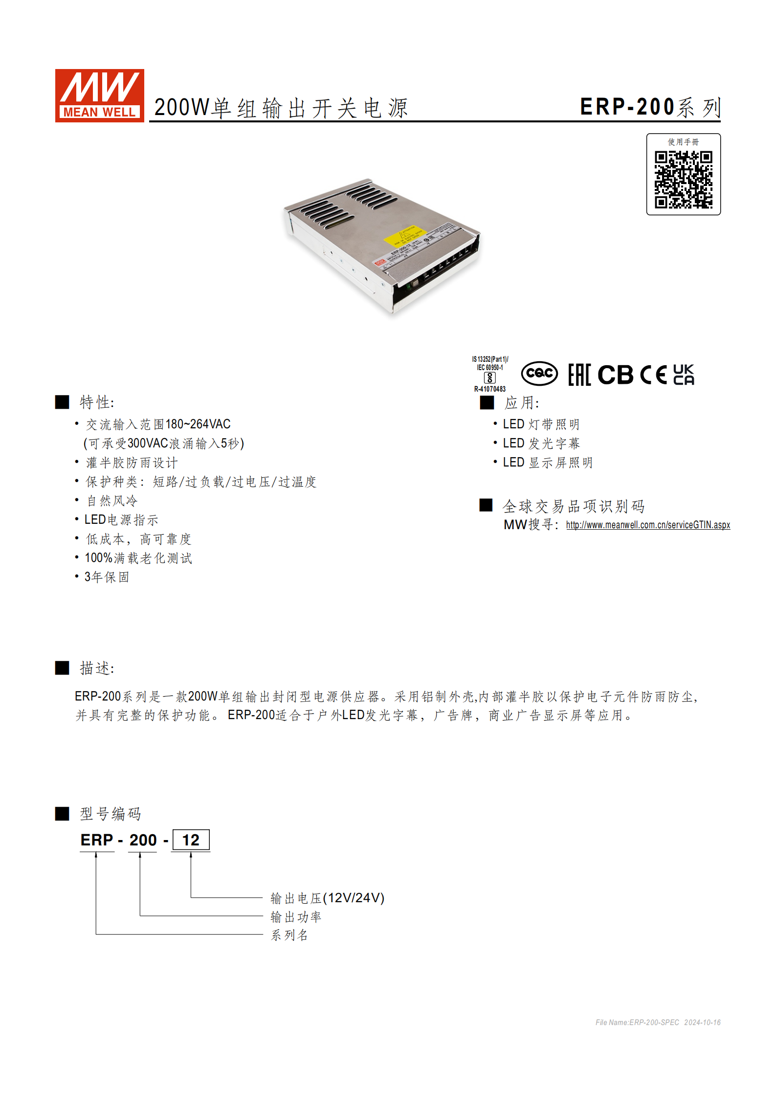 產(chǎn)品類型:200W 單組輸出、封閉灌膠式、自然風(fēng)冷(無風(fēng)扇)戶外型開關(guān)電源
