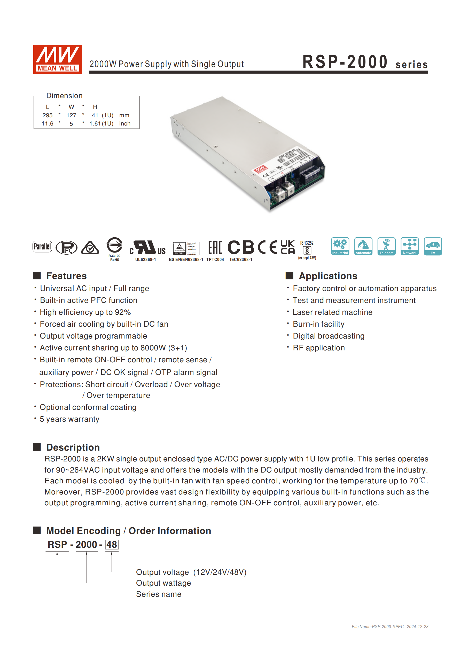 RSP-2000 系列是 1U 低外型 2KW 單組輸出機殼型交流變直流電源供應器,支持 90~264VAC 全范圍交流輸入,內(nèi)建主動式 PFC 功能,效率高達 92%,輸出電壓涵蓋 12V、24V、48V 三種規(guī)格,額定功率分別為 1200W、1920W、2016W,具備輸出電壓可調、主動式并聯(lián)(3+1 可達 8000W)、遙控開關等多種功能,擁有短路 / 過負載 / 過電壓 / 過溫度等全面保護,工作溫度范圍 - 35~+70℃,通過多項國際安規(guī)認證,提供 5 年保固,廣泛應用于工業(yè)控制、測試測量儀器等領域。