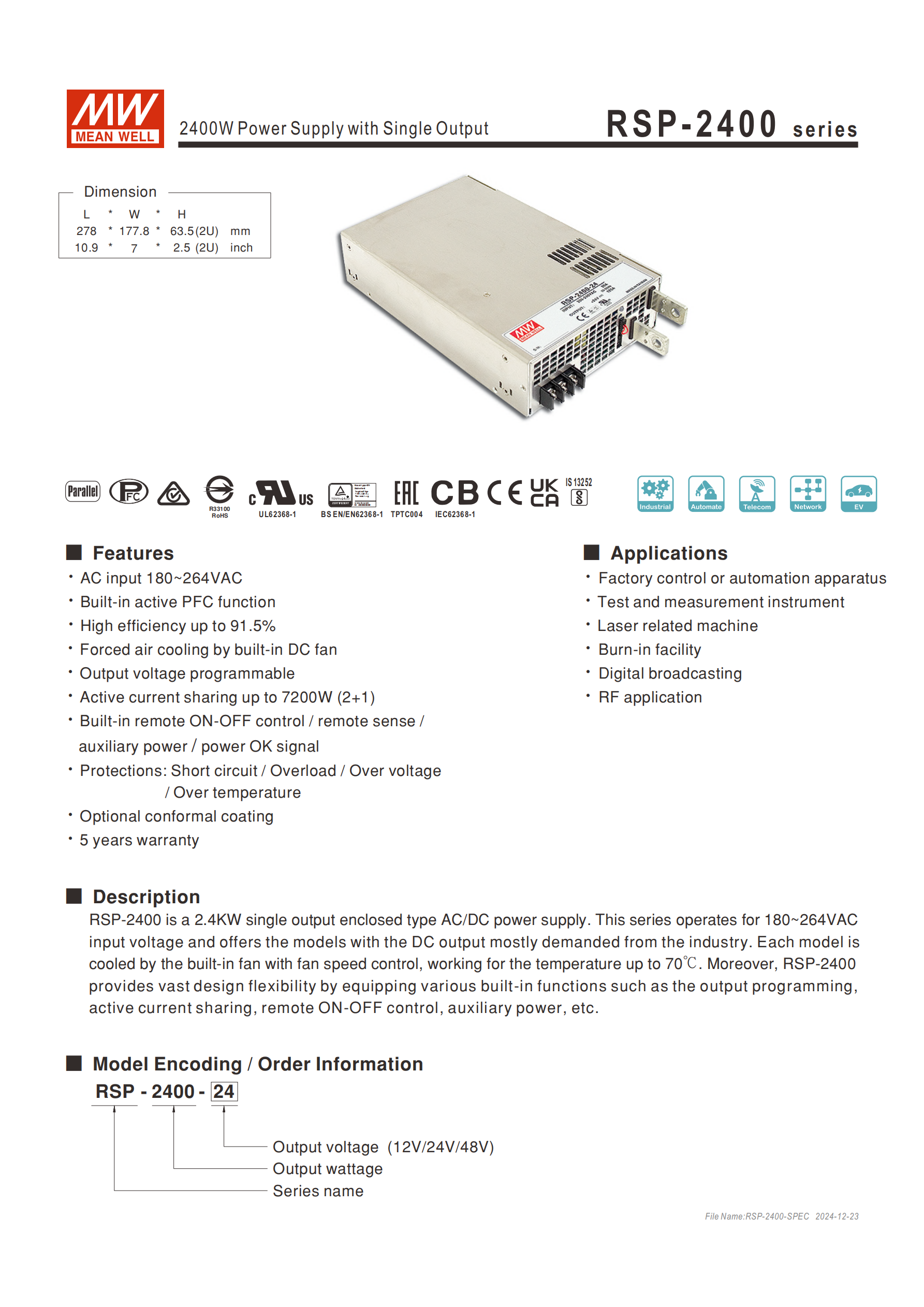 | RSP-2400-24 | 24V | 4.8~28V | 100A | 2400W |