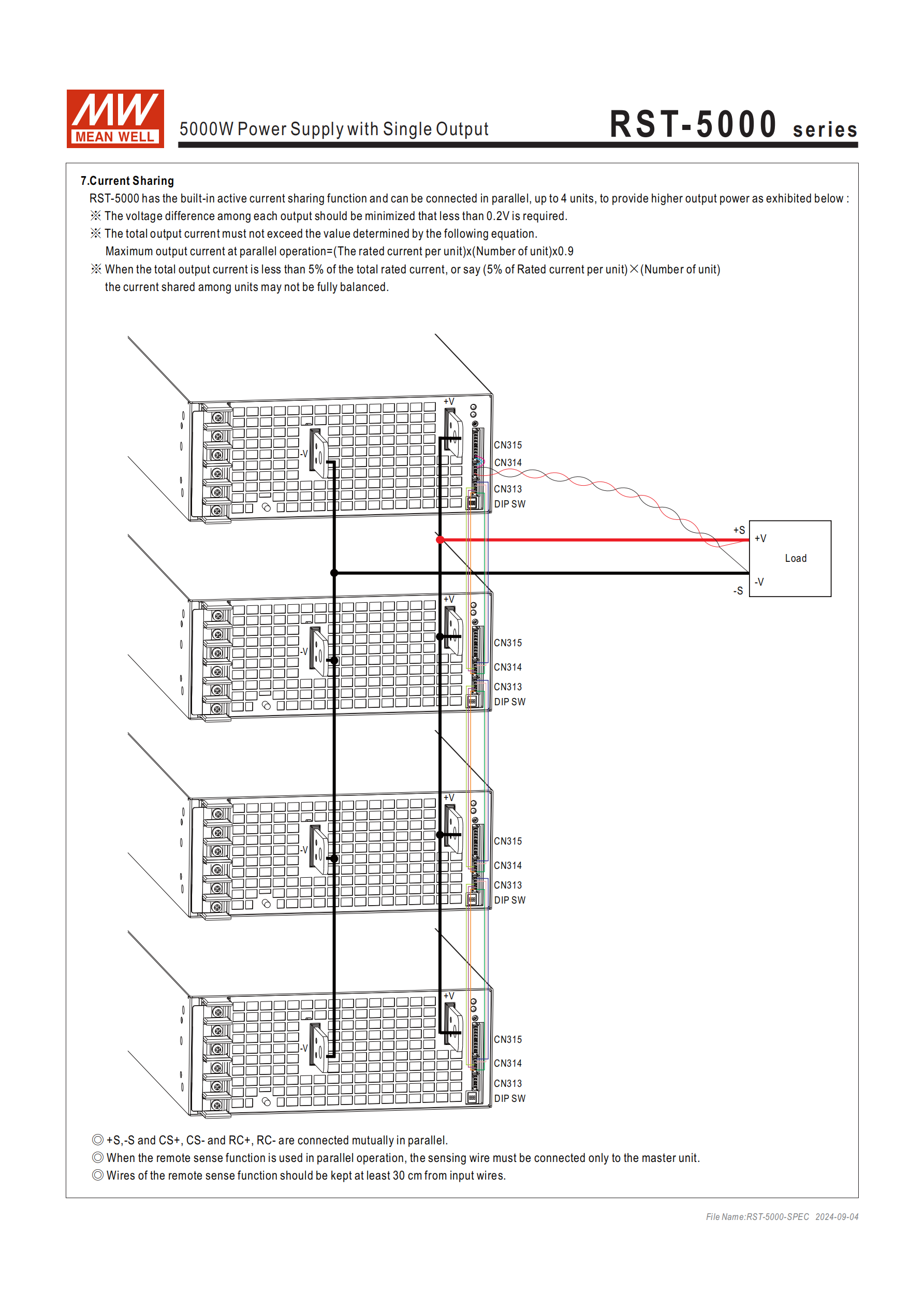 并聯(lián)實(shí)現(xiàn)方式:利用內(nèi)置主動式均流功能,支持 3+1 臺并聯(lián),最大輸出功率可達(dá) 20000W,并聯(lián)時需將各單元的 + S、-S、CS+、CS-、RC+、RC - 相互并聯(lián)。