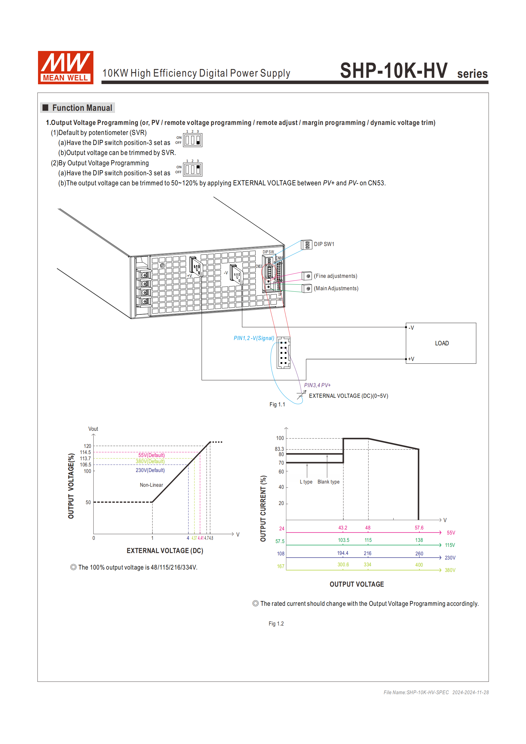 | 輸出電壓編程(PV) | 50~120% 額定輸出電壓 | 1. 內(nèi)建電位器(SVR);2. CN53 的 PV+/PV - 施加 0~5V 外部電壓 |
