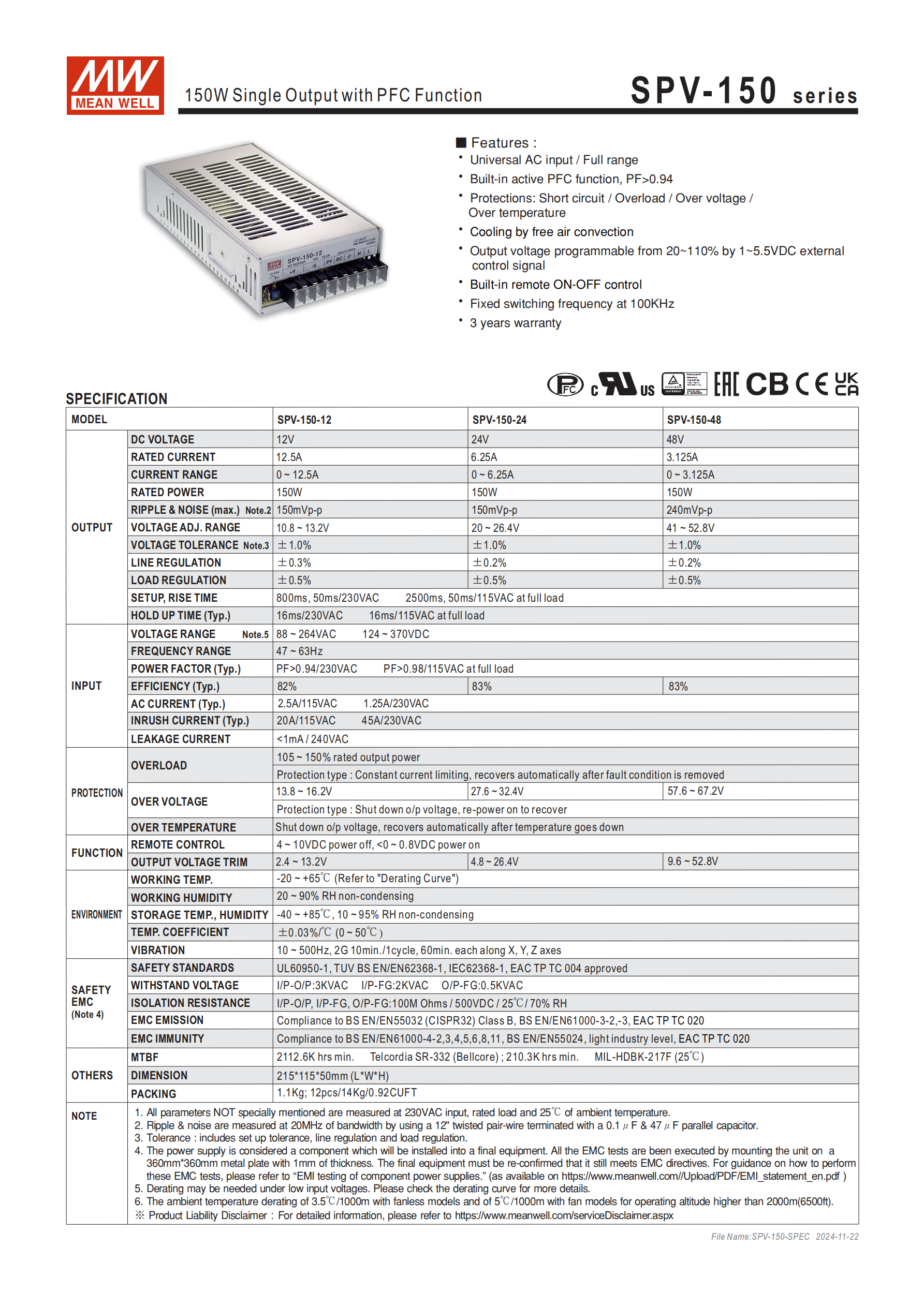 | SPV-150-48 | 48V | 3.125A |