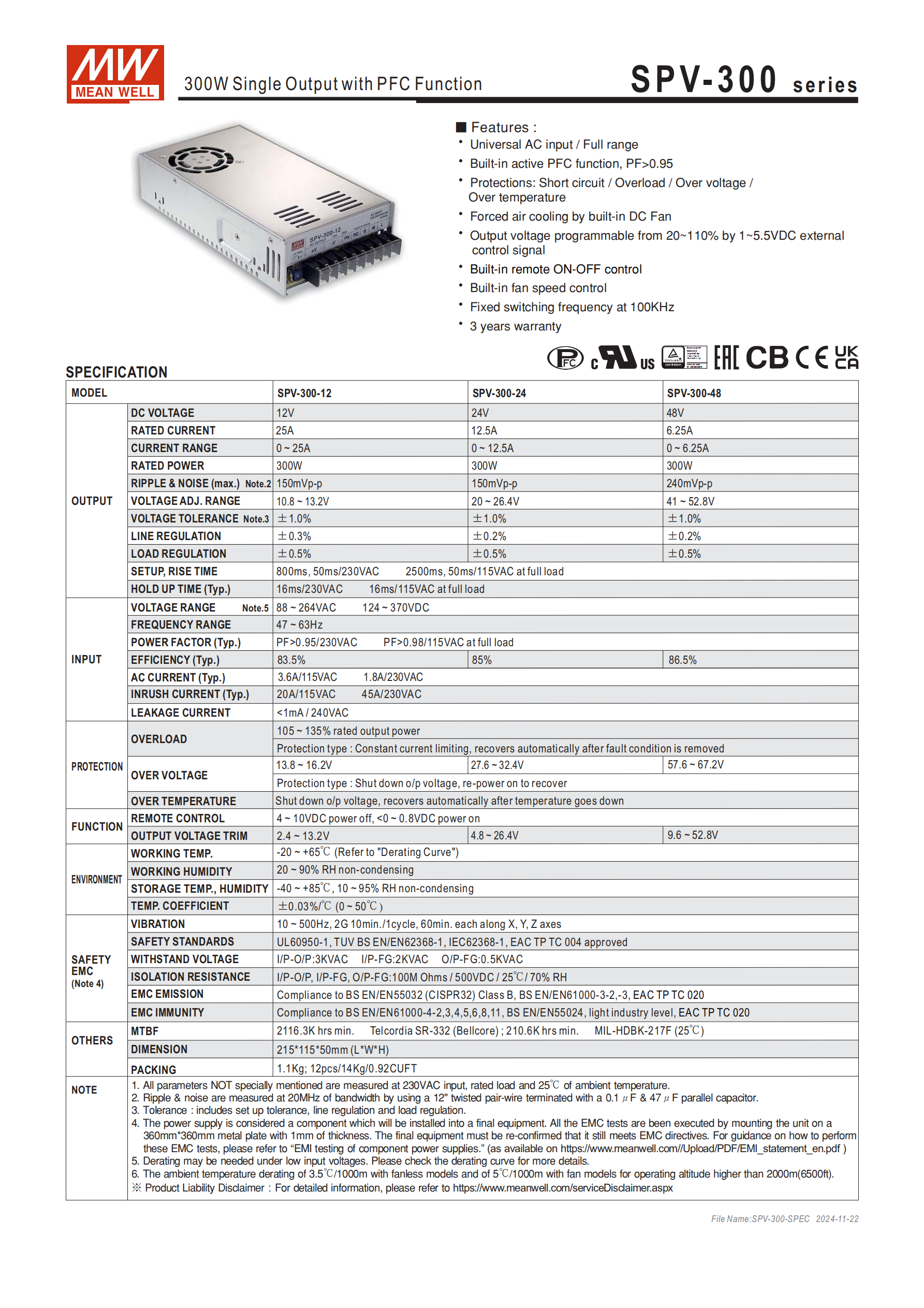 MEAN WELL SPV-300 系列是300W 單組輸出且具備主動(dòng)式 PFC 功能的開關(guān)電源,包含 SPV-300-12、SPV-300-24、SPV-300-48 三款型號(hào),對(duì)應(yīng)額定輸出電壓 12V、24V、48V 及不同額定電流,支持88~264VAC 或 124~370VDC 寬范圍輸入,具備短路 / 過負(fù)載 / 過電壓 / 過溫度等多重保護(hù),可通過 1~5.5VDC 控制信號(hào)實(shí)現(xiàn)20~110% 輸出電壓可調(diào),內(nèi)置遙控開關(guān)與風(fēng)扇速度控制電路,工作溫度范圍 - 20~+65℃,通過多項(xiàng)國(guó)際安規(guī)認(rèn)證,提供 3 年保固。