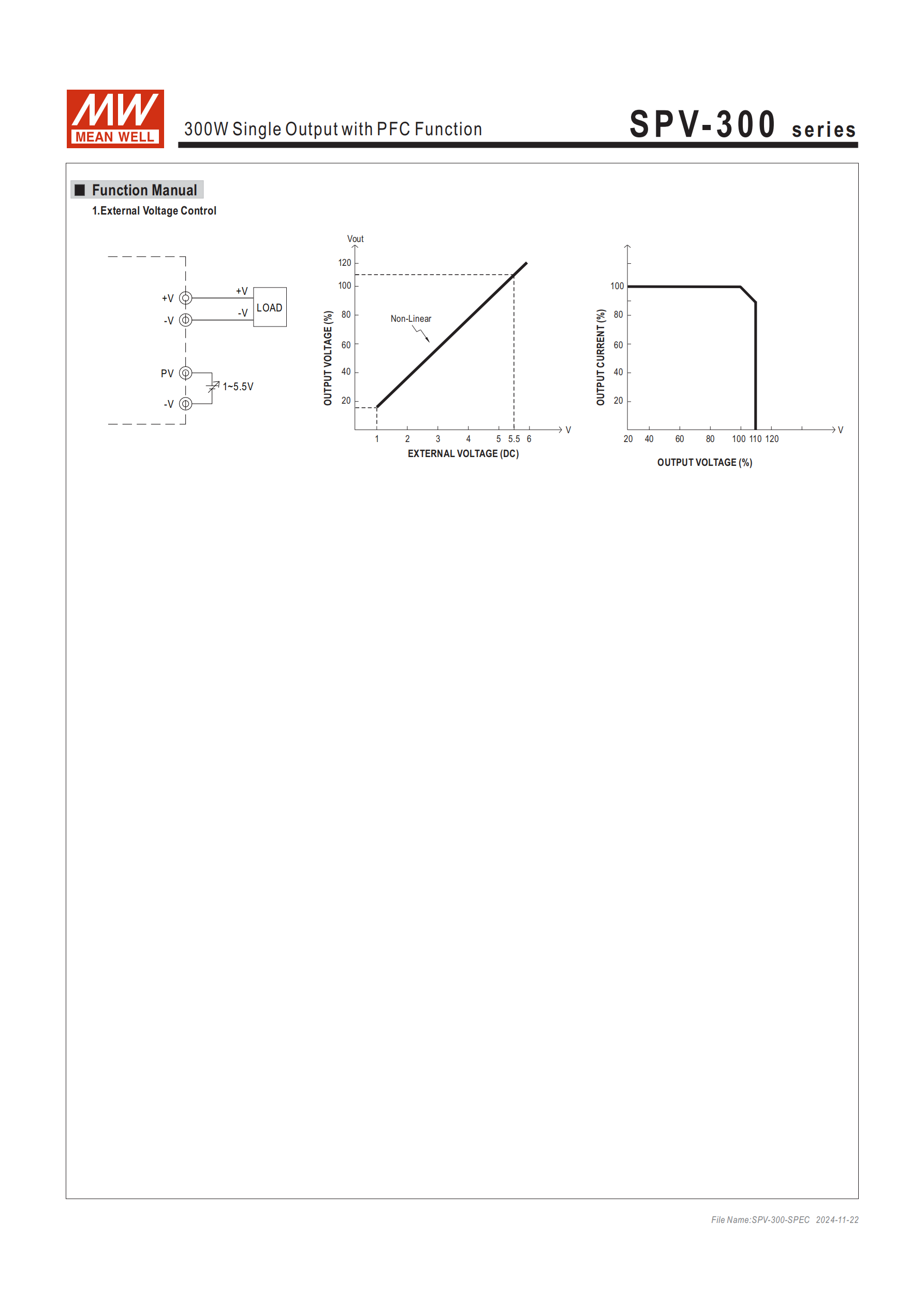 外部電壓控制調(diào)整:通過外加1~5.5VDC 控制信號(hào)實(shí)現(xiàn),調(diào)整范圍擴(kuò)展至額定電壓的 20%~110%,具體區(qū)間為 2.4~13.2V(SPV-300-12)、4.8~26.4V(SPV-300-24)、9.6~52.8V(SPV-300-48);補(bǔ)充:調(diào)整精度包含設(shè)定誤差、線性調(diào)整率和負(fù)載調(diào)整率,整體精度≤±1.0%。