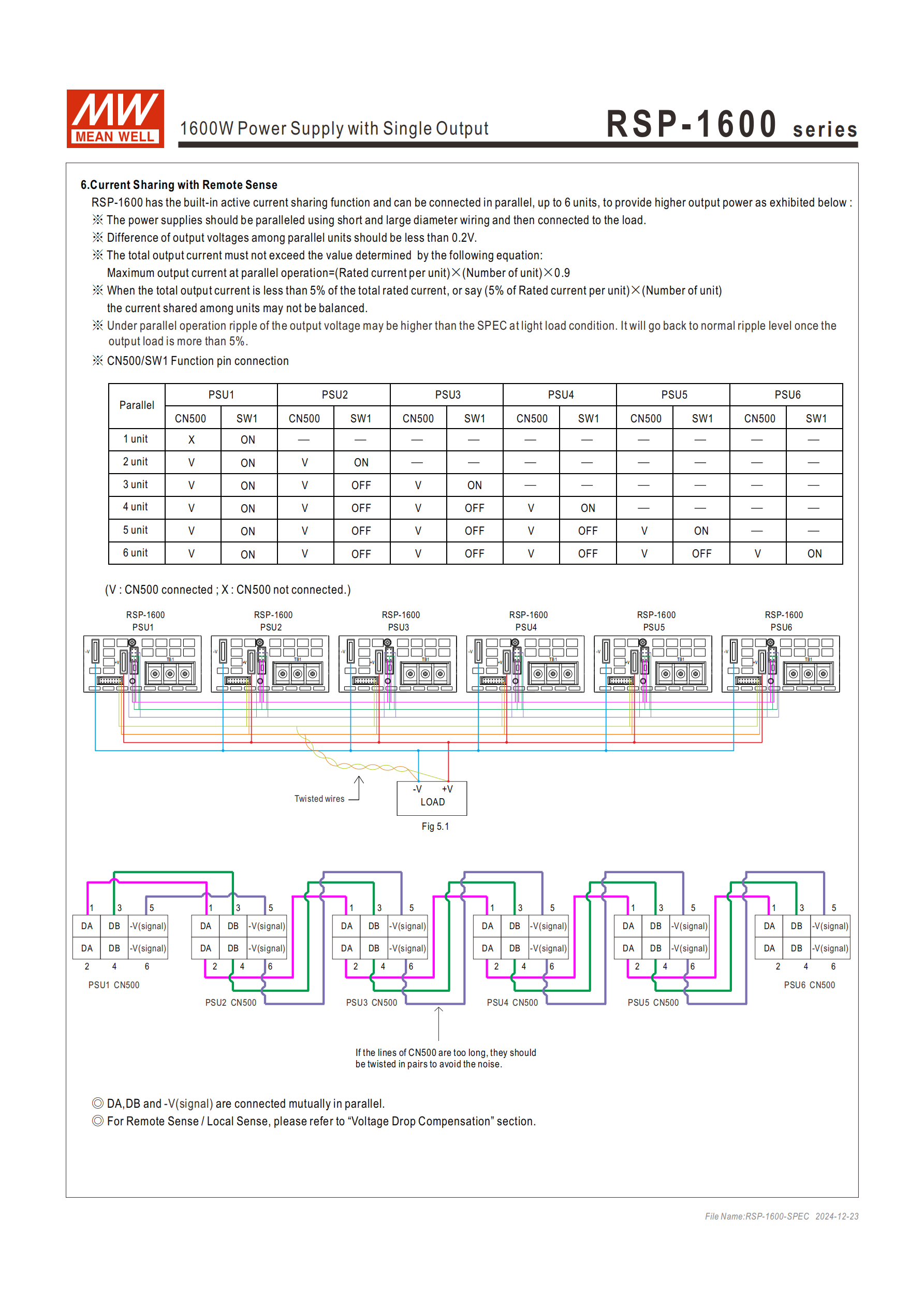 硬件連接:使用短而粗的導(dǎo)線并聯(lián)各電源,再連接負載;CN500/SW1 需按并聯(lián)臺數(shù)設(shè)置(1 臺 = X/ON,2 臺 = V/ON+V/ON,3 臺 = V/ON+V/OFF+V/ON 等,V = 連接插腳,X = 不連接)。