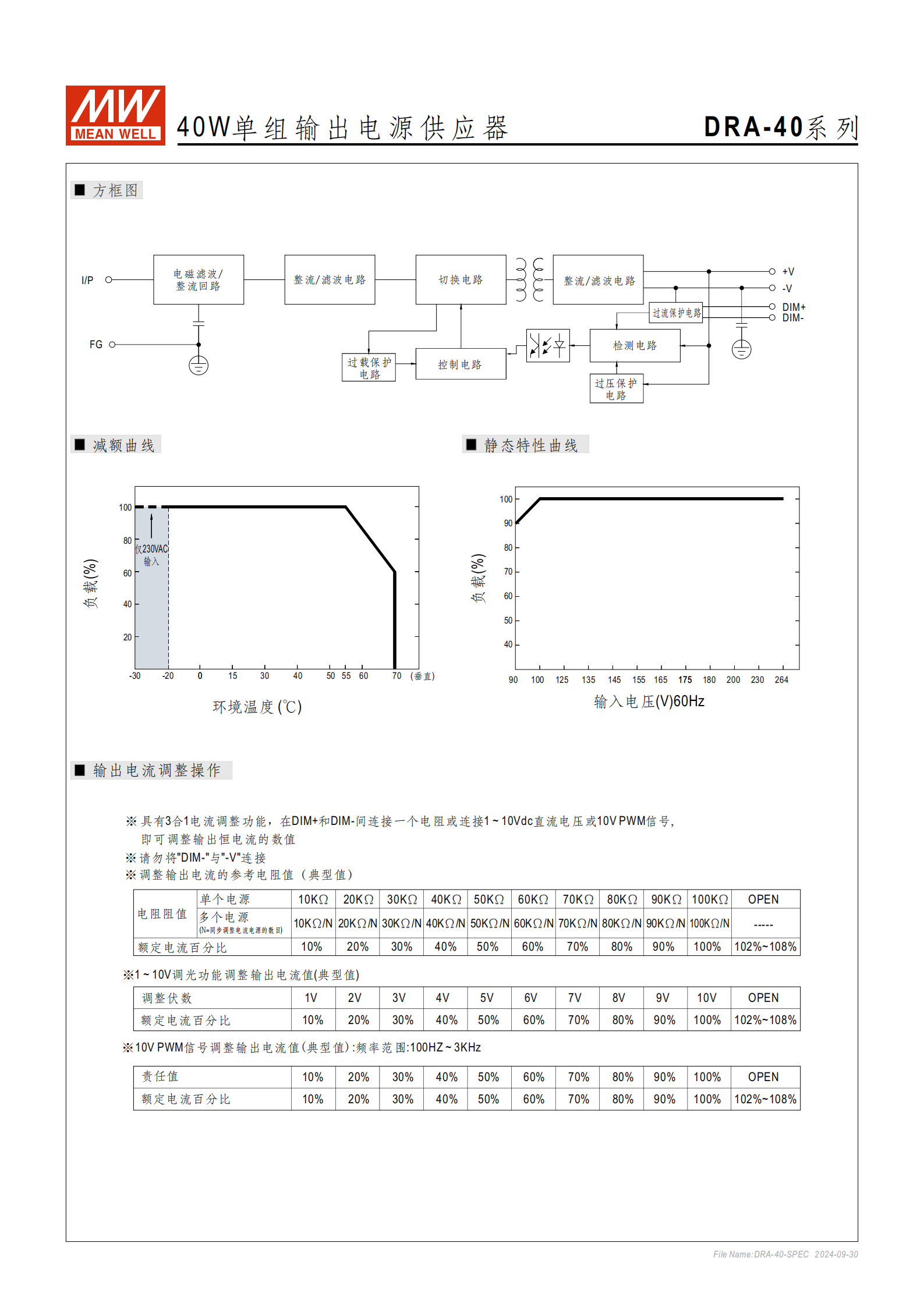 型號核心差異(輸出側(cè)):| 參數(shù) | DRA-40-12 | DRA-40-24 ||------|-----------|-----------|| 輸出電壓 | 12V(調(diào)整范圍 12~15V) | 24V(調(diào)整范圍 24~30V) || 額定電流 | 3.34A | 1.7A || 紋波與噪聲(最大) | 120mVp-p | 150mVp-p || 過電壓保護范圍 | 14.49~18.63V | 28.98~37.26V || 效率(Typ.) | 85% | 87% |