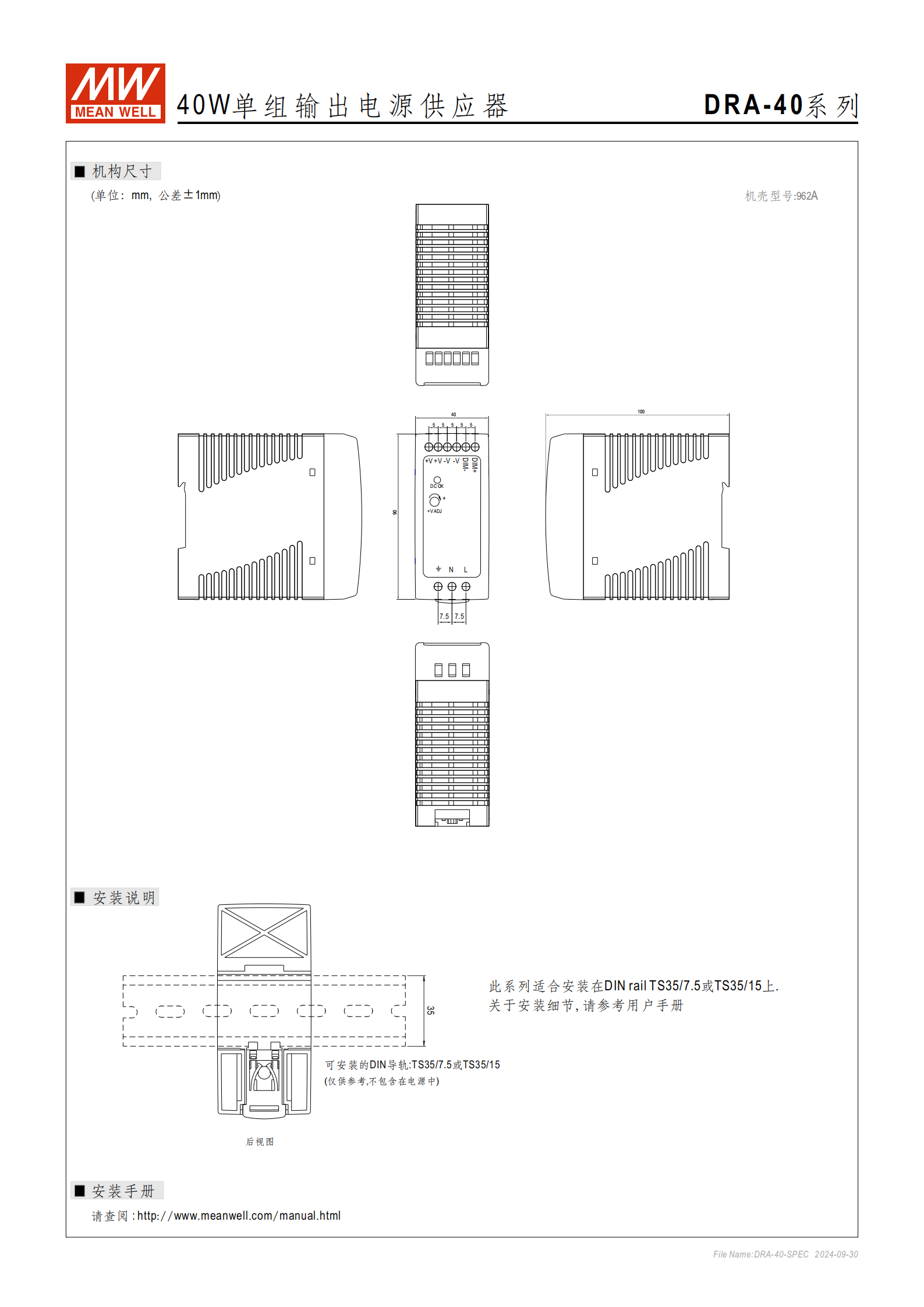品牌與系列:MEAN WELL(明緯) DRA-40 系列,定位為40W 單組輸出導軌型電源供應器,符合德國工業(yè)標準