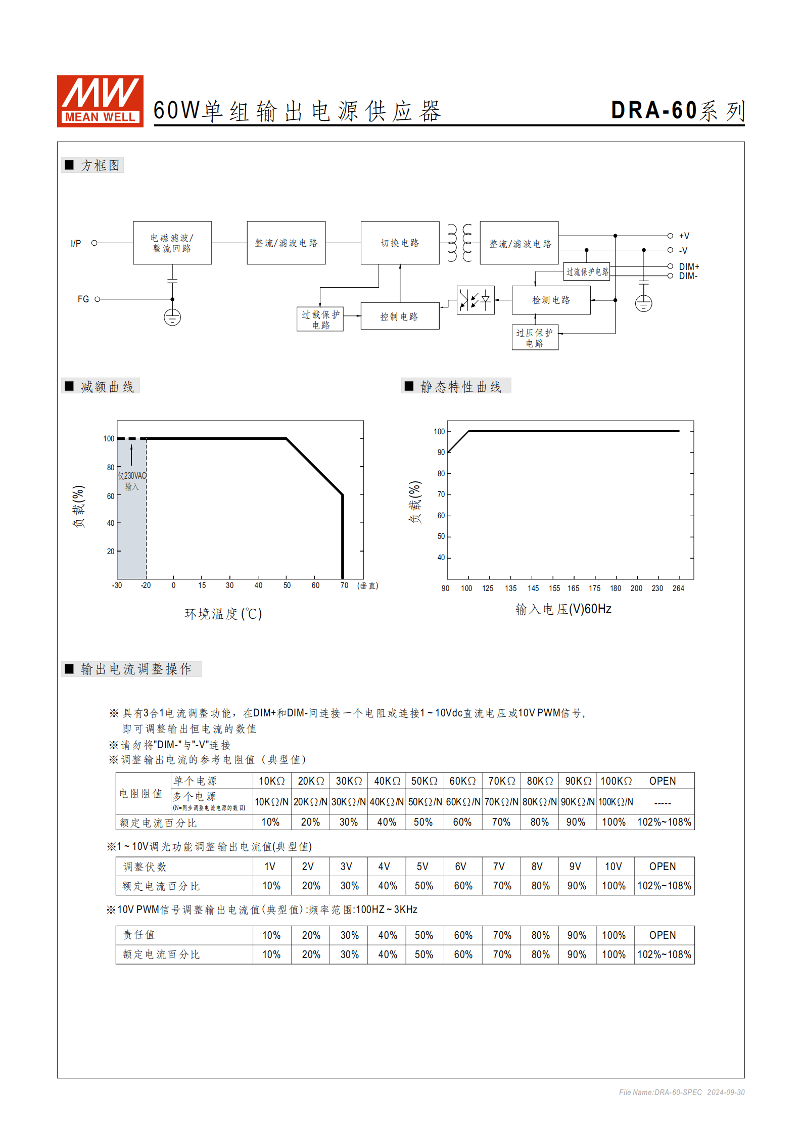 電阻調(diào)整(DIM + 與 DIM - 間連接電阻)| 電阻阻值 | 單個電源額定電流百分比 | 多個電源(N 臺同步)額定電流百分比 ||----------|------------------------|----------------------------------|| 10KΩ | 10% | 10% || 20KΩ | 20% | 20%/N || 30KΩ | 30% | 30%/N || 40KΩ | 40% | 40%/N || 50KΩ | 50% | 50%/N || 60KΩ | 60% | 60%/N || 70KΩ | 70% | 70%/N || 80KΩ | 80% | 80%/N || 90KΩ | 90% | 90%/N || 100KΩ | 100% | 100%/N || OPEN | 102%~108% | - |