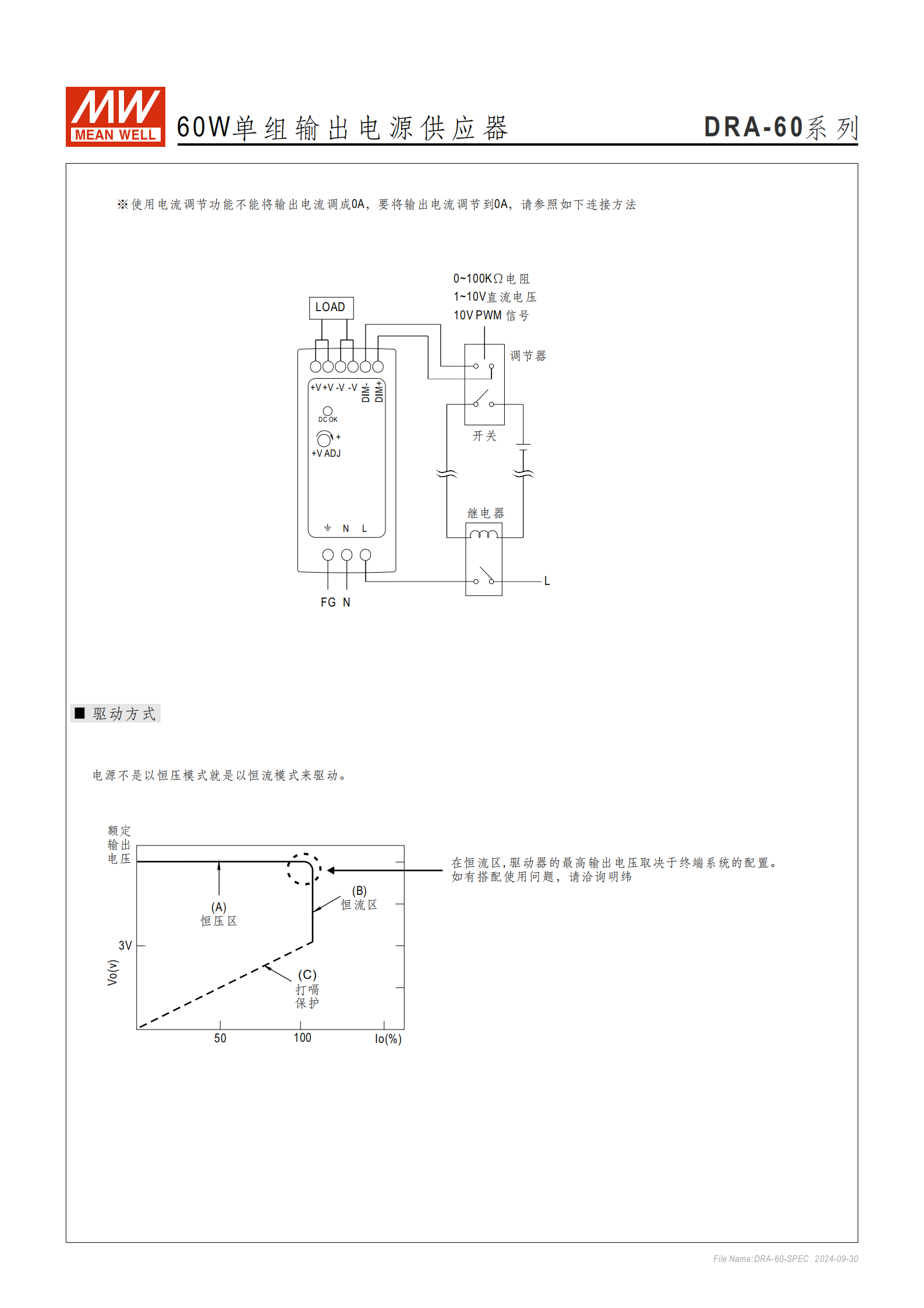 DRA-60-24:輸出直流電壓 24V(可調(diào)整至 24~30V),額定電流 2.5A,電流范圍 0~2.5A,恒流范圍 3~24V,最大紋波與噪聲 150mVp-p;