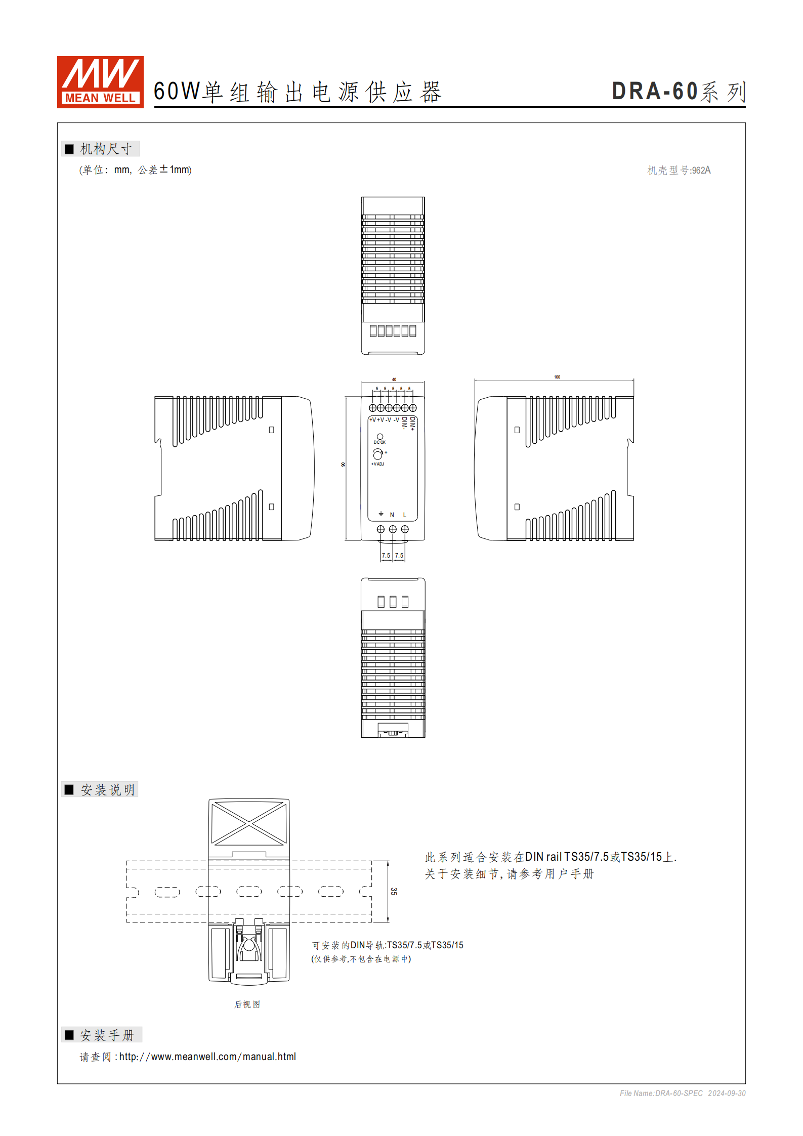 品牌與系列:MEAN WELL(明緯)DRA-60 系列,60W 單組輸出交變直流導(dǎo)軌型電源供應(yīng)器