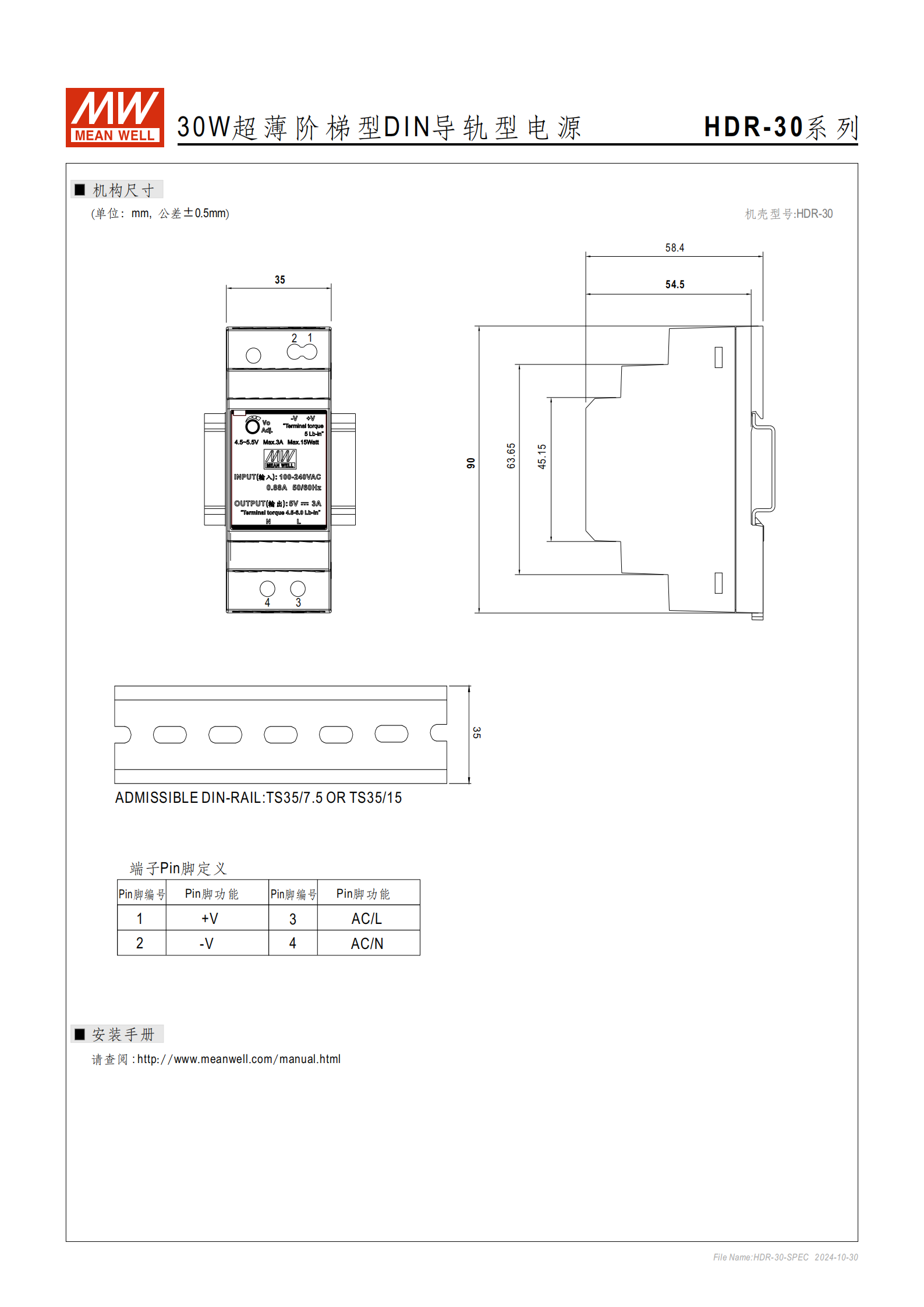 HDR-60-5:額定功率 32.5W,電壓調(diào)整范圍 5.0~5.5V