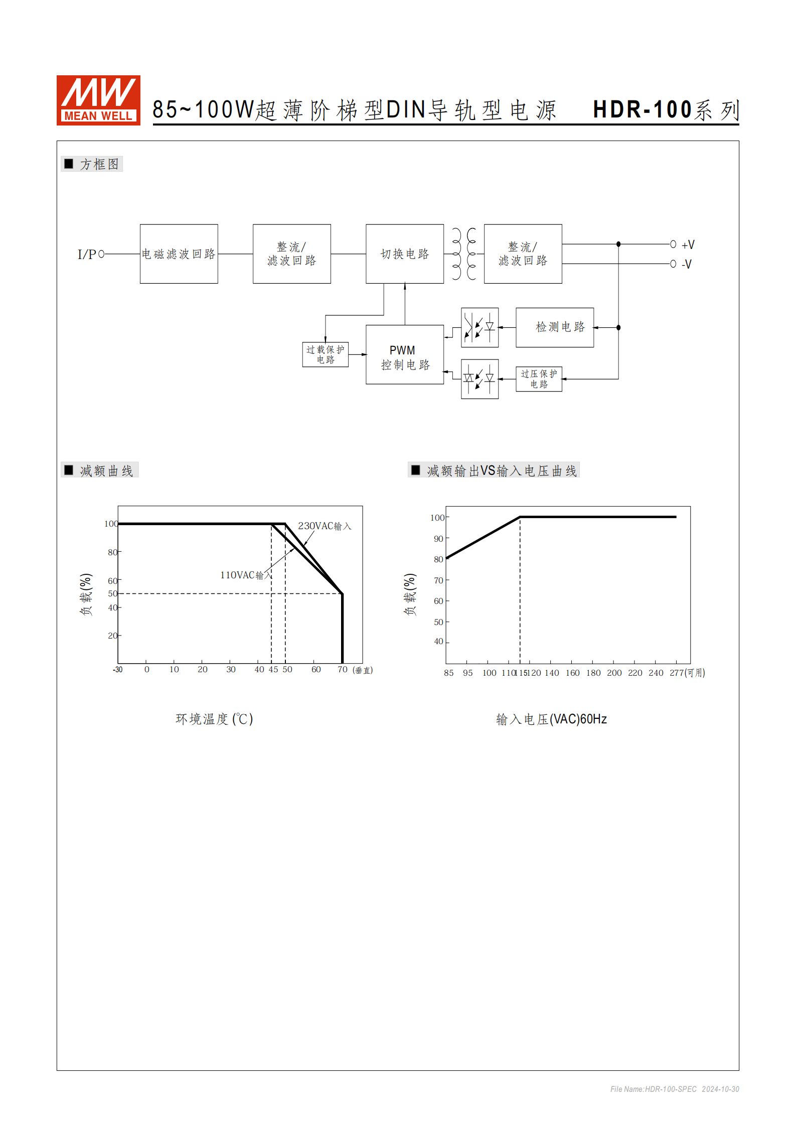 HDR-100 系列是功率范圍 85~100W 的超薄階梯型 DIN 導(dǎo)軌型電源,寬度僅 70mm(4SU),支持 85~264VAC(277VAC 可用)國際通用輸入,具備 ClassⅡ 隔離級別、短路 / 過負(fù)載 / 過電壓保護(hù)功能,工作溫度范圍 - 30~+70°C,自然風(fēng)冷設(shè)計(jì),可安裝在 TS-35/7.5 或 15 導(dǎo)軌上,通過 UL62368-1 等多項(xiàng)國際認(rèn)證,適用于家居控制、工業(yè)自動化等場景,提供 3 年保固,空載損耗<0.3W,效率最高達(dá) 90%,輸出電壓可根據(jù)型號(含標(biāo)準(zhǔn)品與 N 型 LPS 版本)實(shí)現(xiàn)不同范圍調(diào)節(jié)。