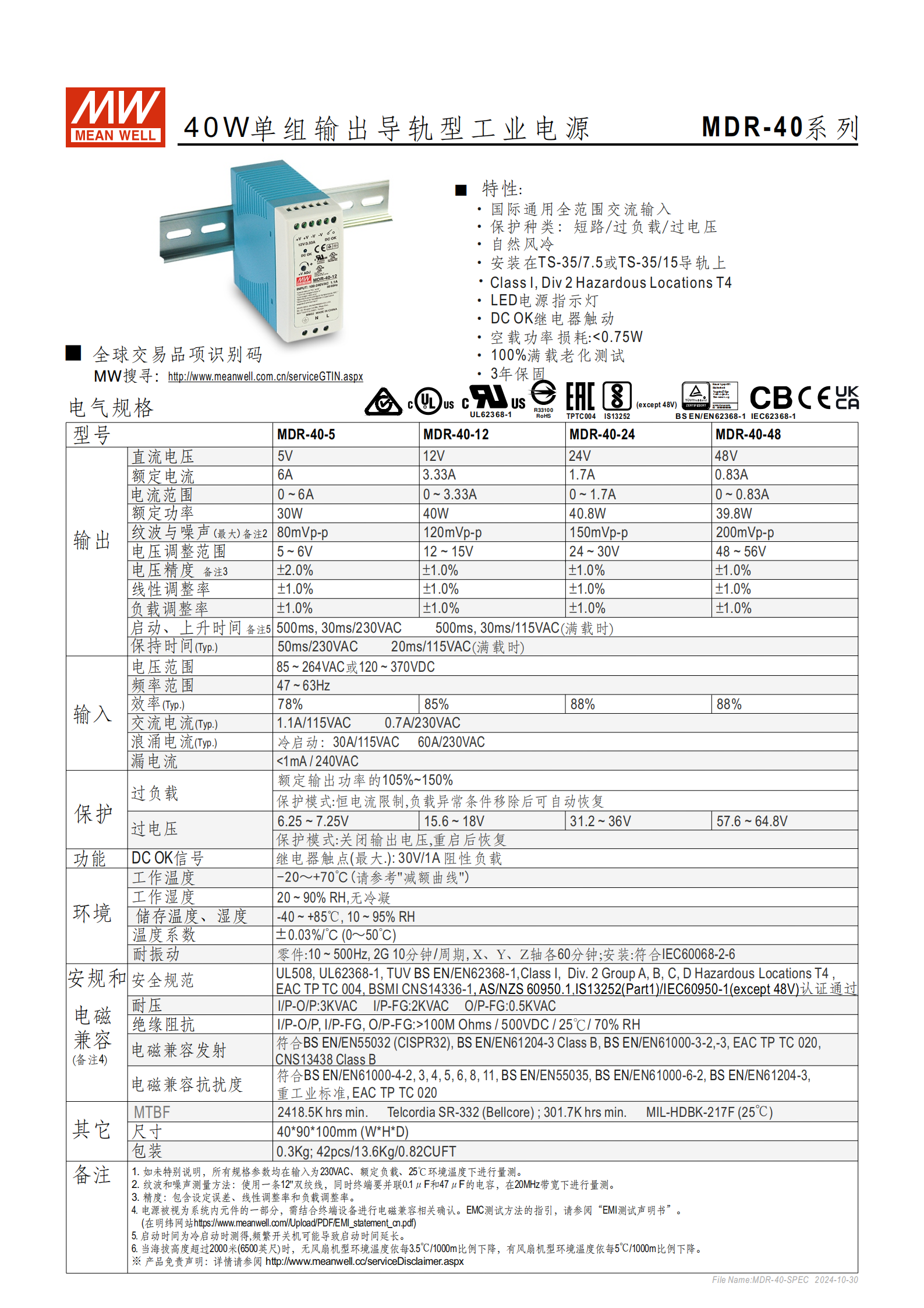 | 系列型號 | MDR-40 系列(MDR-40-5、MDR-40-12、MDR-40-24、MDR-40-48) |