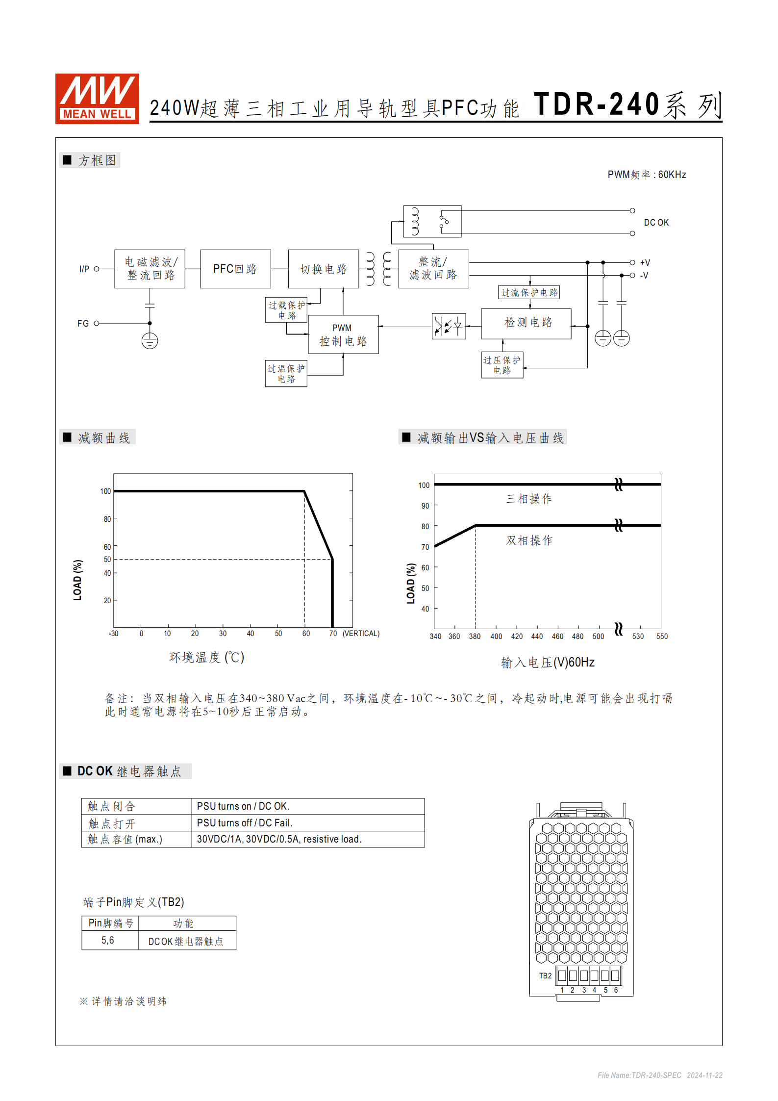 答案:輸入方面,支持 340~550VAC 三相輸入(可雙相操作)、47~63Hz 頻率,功率因數(shù)≥0.52(滿載);輸出分兩款型號,TDR-240-24 為 24~28V/10A(0~10A 可調(diào))、紋波 100mVp-p,TDR-240-48 為 48~55V/5A(0~5A 可調(diào))、紋波 120mVp-p,兩者額定功率均為 240W、電壓精度 ±1.0%。適用負載類型為電感性或電容性負載,內(nèi)置恒電流限制電路和多重保護,適配工業(yè)復雜負載場景。