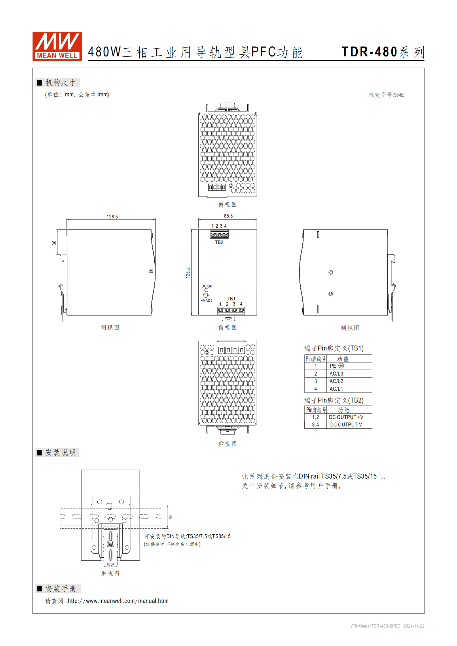 關(guān)鍵標(biāo)識:系列名 TDR-480,型號編碼規(guī)則為 “系列名 - 輸出功率 - 輸出電壓”(如 TDR-480-24)