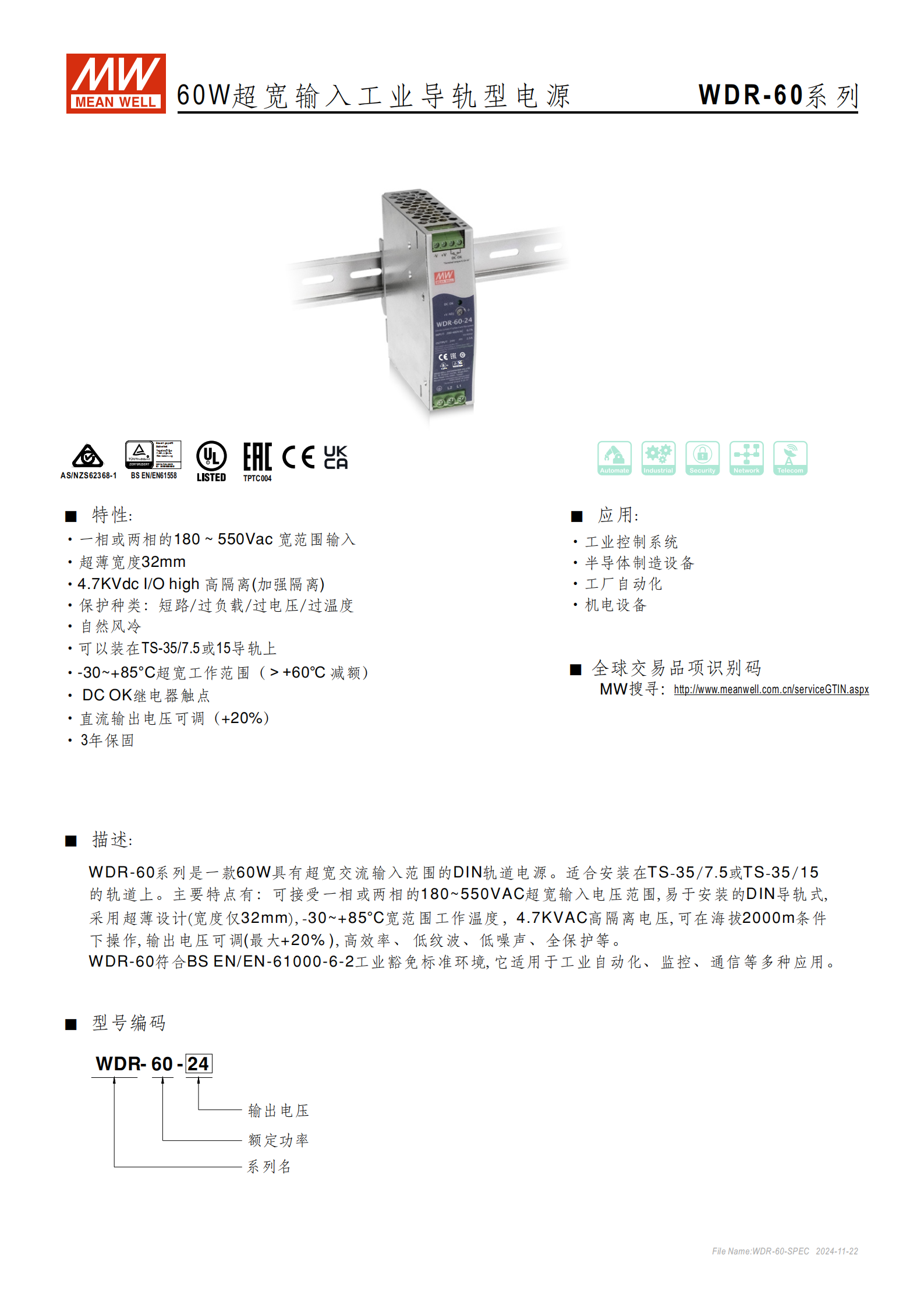 明緯 WDR-60 系列是一款60W 超寬輸入工業(yè)導軌型電源,具備180~550Vac/254~780Vdc 超寬輸入電壓范圍、32mm 超薄寬度,支持安裝在 TS-35/7.5 或 15 導軌上,工作溫度覆蓋 -30~+85°C(>60℃需減額),擁有4.7KVac 高隔離電壓及短路 / 過負載 / 過電壓 / 過溫度全保護功能,輸出電壓可在額定值基礎上 **+20% 可調 **,效率最高達 90.5%,適用于工業(yè)控制系統、半導體制造設備等場景,提供 3 年保固。