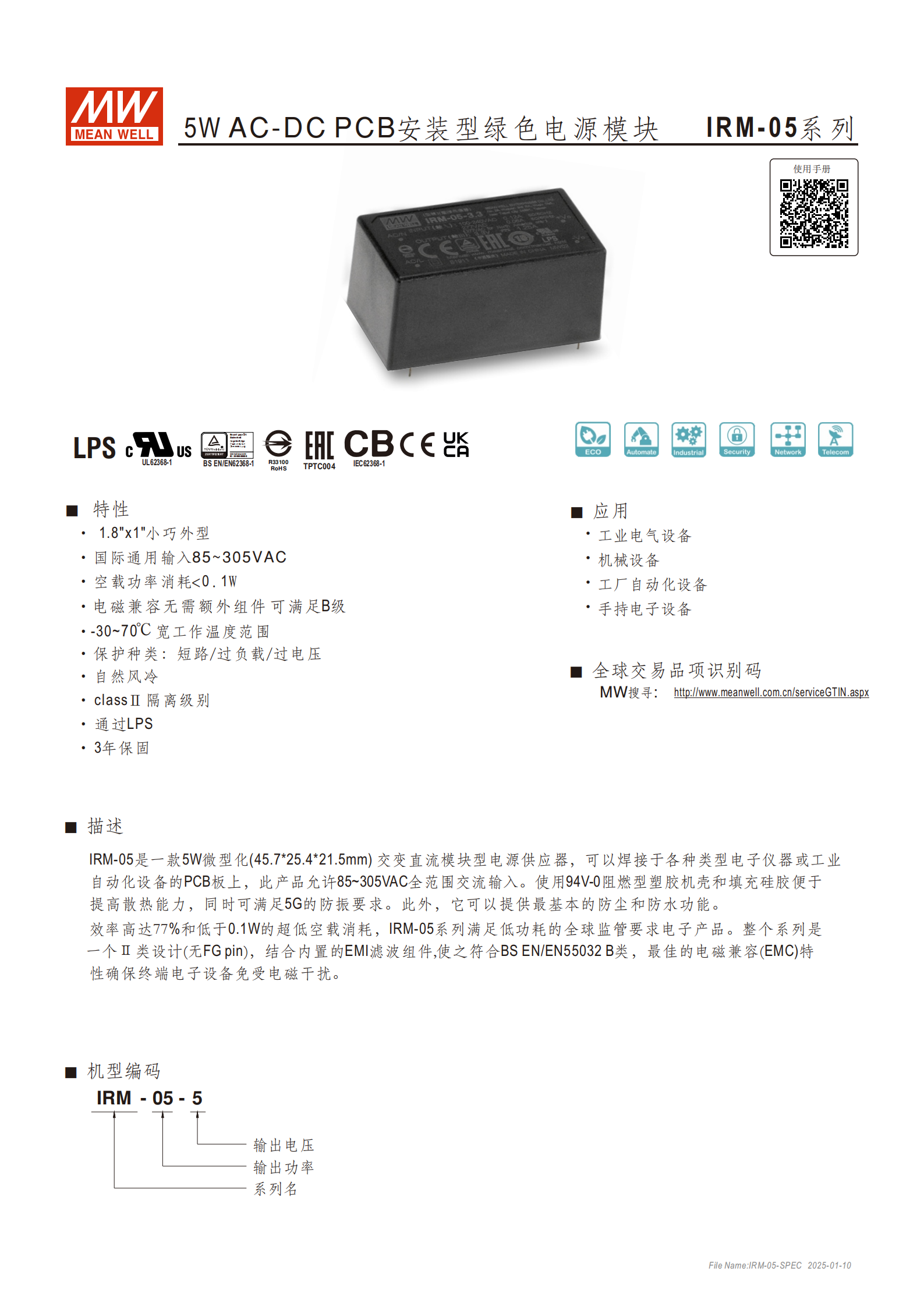 產(chǎn)品名稱:IRM-05 系列 5W AC-DC PCB 安裝型綠色電源模塊
