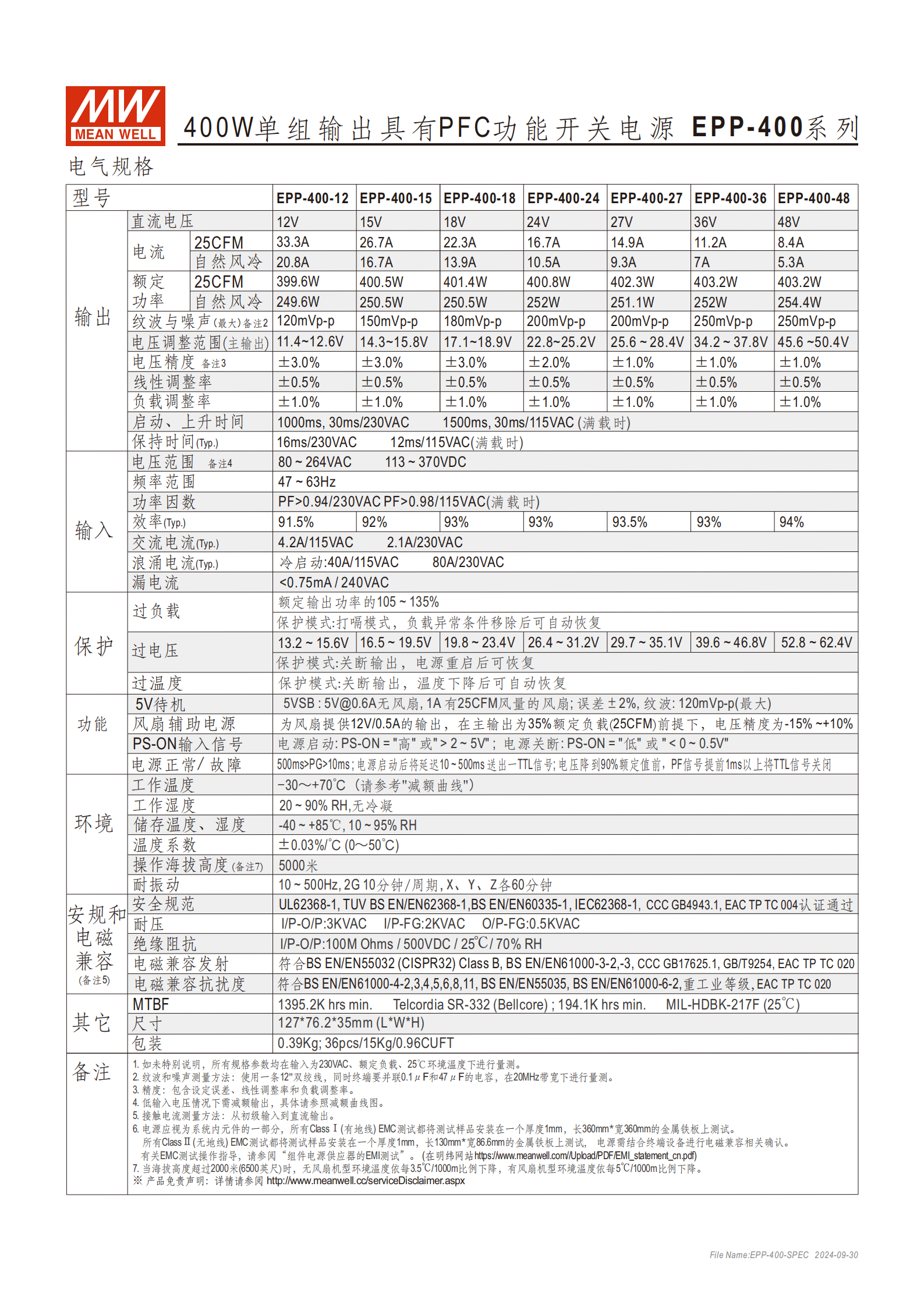 | 輸出電壓 | 12V、15V、24V、27V、36V、48V | 對(duì)應(yīng)型號(hào)分別為 EPP-400-12 至 EPP-400-48 |