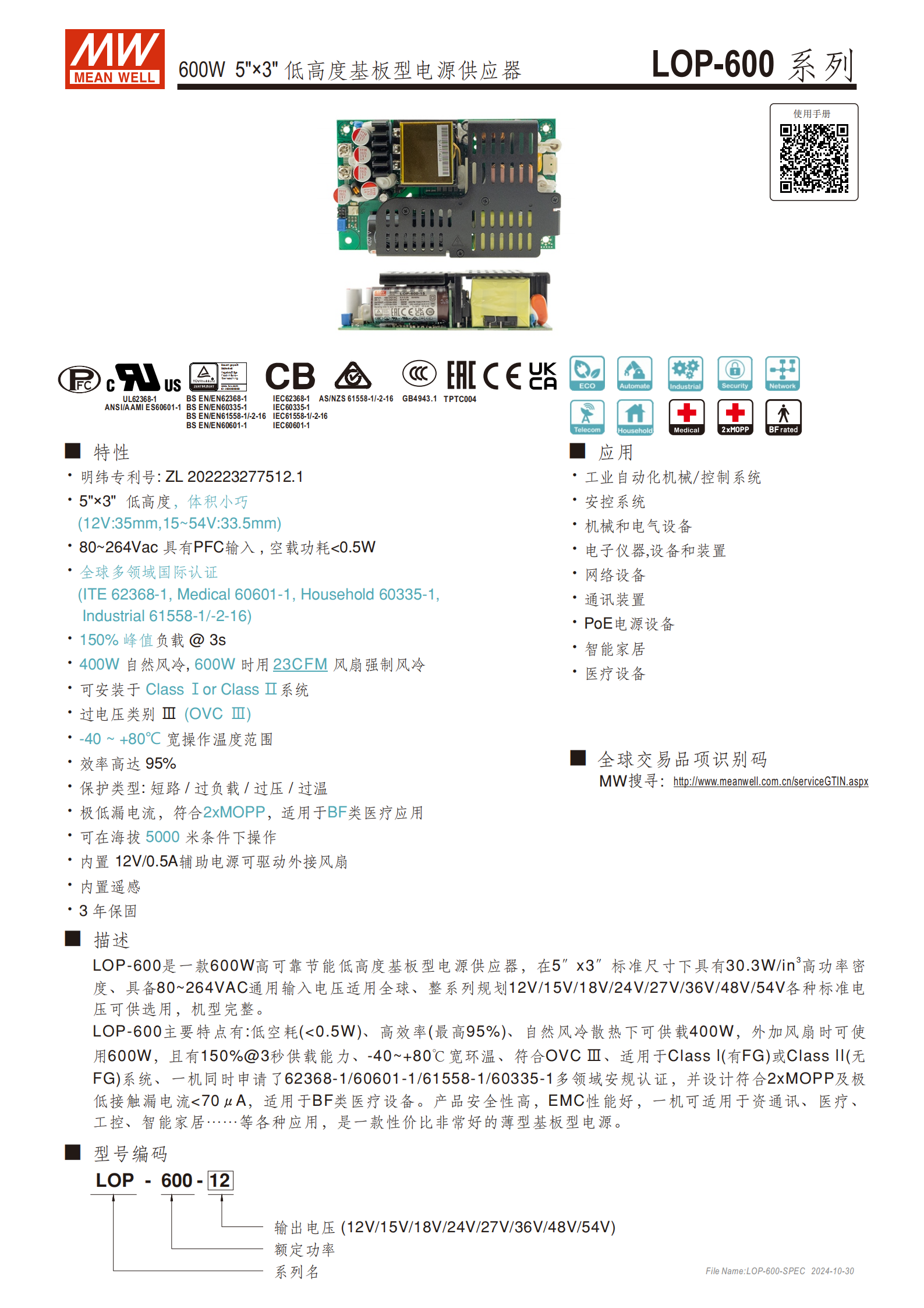 LOP-600 系列是一款 600W 5"×3" 低高度基板型電源供應(yīng)器,具備80~264VAC 通用輸入電壓、-40~+80℃寬工作溫度范圍,效率高達(dá)95% ,空載功耗 < 0.5W,自然風(fēng)冷下最大輸出功率 360W(12V 機(jī)型)/400W(15~54V 機(jī)型),外接風(fēng)扇時(shí)可達(dá) 600W,支持 150%×3 秒峰值負(fù)載,通過IEC62368-1、IEC60601-1 等多領(lǐng)域國際認(rèn)證,符合 2xMOPP 標(biāo)準(zhǔn)及超低漏電流要求,適用于醫(yī)療設(shè)備、工業(yè)自動(dòng)化、通訊裝置等多場景,提供 3 年保固。
