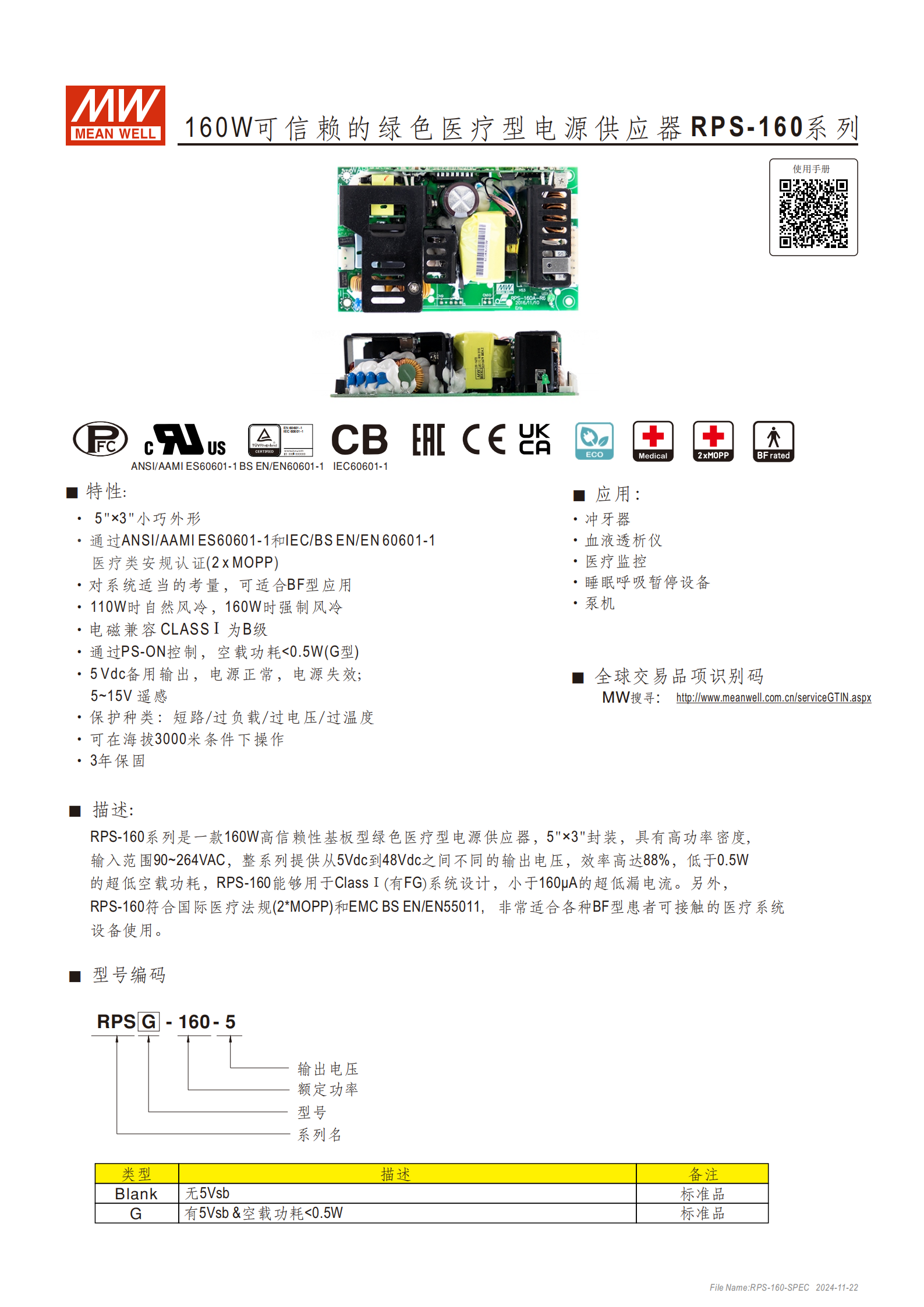 RPS-160 系列是5"×3" 小巧封裝的 160W 高信賴性綠色醫(yī)療型電源供應(yīng)器,通過IEC/BS EN/EN 60601-1、ANSI/AAMI ES60601-1 等醫(yī)療類安規(guī)認證(2×MOPP) ,符合 BF 型應(yīng)用要求,輸入范圍90~264VAC,輸出電壓涵蓋5Vdc~48Vdc,效率高達88% ,空載功耗(G 型)<0.5W,漏電流 <160μA,具備短路 / 過負載 / 過電壓 / 過溫度等多重保護,可在海拔3000 米環(huán)境下操作,適用于沖牙器、血液透析儀等多種醫(yī)療設(shè)備,提供3 年保固。