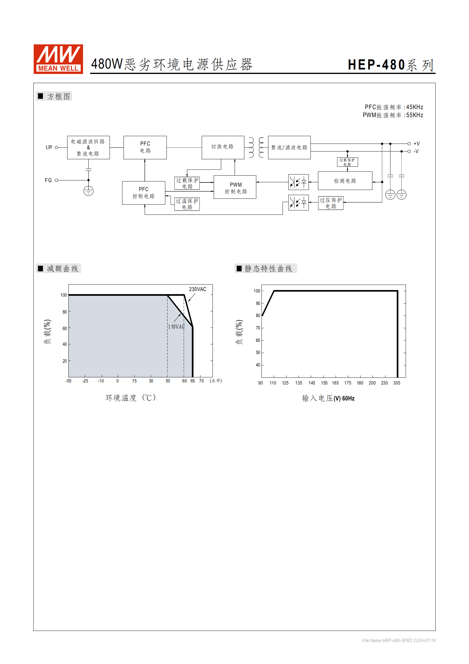 | HEP-480-48 | 48V | 10A | 480W | 40.8~50.4V | 5~10A | 250mVp-p | ±1.0% |