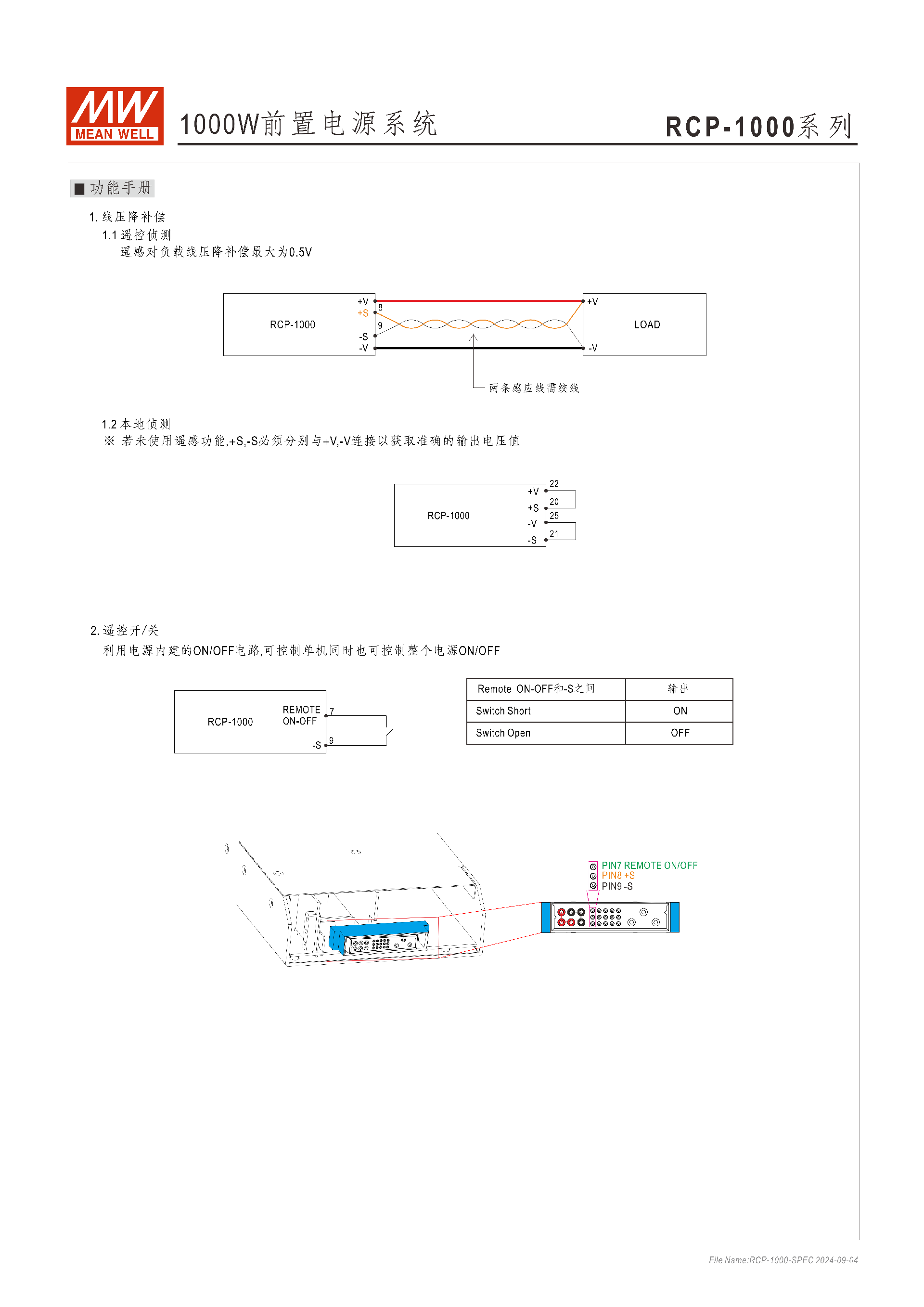 線壓降補償:遙控偵測可補償線壓降達 0.5V,未使用時需將 + S/-S 與 + V/-V 短接