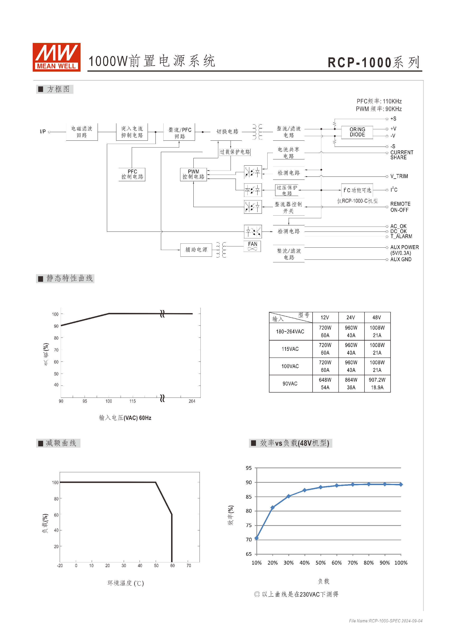 | RCP-1000-48 | 48V(46.3~49.7V) | 21A | 1008W | 高壓大功率場景,如電動汽車充電系統(tǒng)、冗余電力系統(tǒng) |