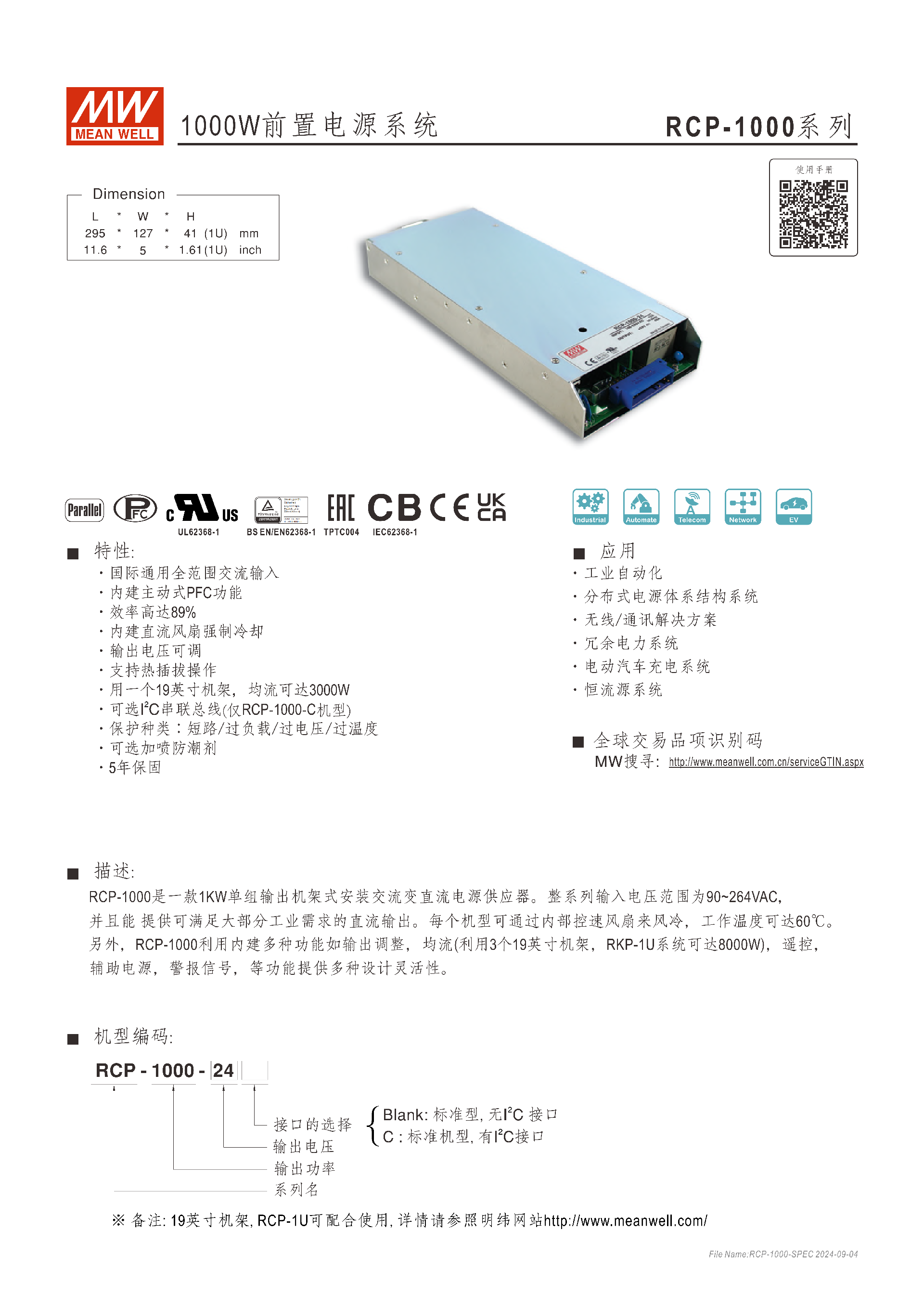 RCP-1000 系列是 1KW 單組輸出機架式交流變直流電源供應器,輸入電壓范圍 90~264VAC,工作溫度 - 20~+60°C,效率高達 89%,包含 RCP-1000-12(12V/60A/720W)、RCP-1000-24(24V/40A/960W)、RCP-1000-48(48V/21A/1008W)三款機型,具備輸出電壓可調(diào)、均流、遙控、輔助電源、多重保護(短路 / 過負載 / 過電壓 / 過溫度) 等功能,支持熱插拔和 19 英寸機架安裝(3 臺均流可達 3000W,RKP-1U 系統(tǒng)可達 8000W),可選 I2C 串聯(lián)總線(僅 C 機型)和防潮劑,通過多項國際安全認證,5 年保固,廣泛應用于工業(yè)自動化、通訊、電動汽車充電等領域。