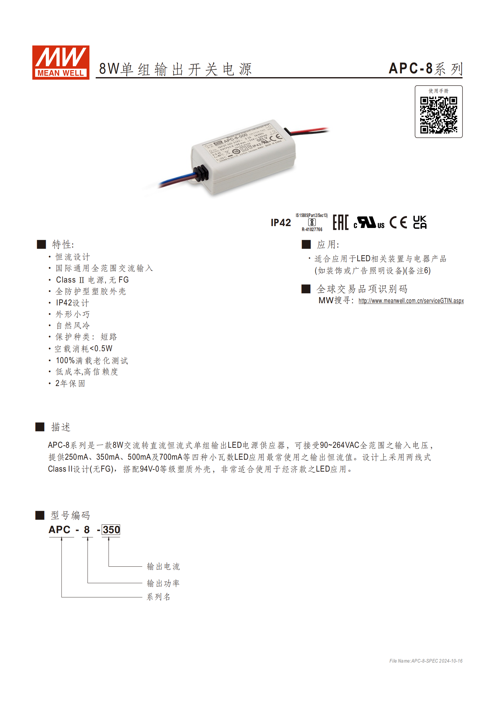 MEAN WELL APC-8 系列是一款 8W 交流轉(zhuǎn)直流恒流式單組輸出 LED 電源供應(yīng)器,具備90~264VAC 全范圍輸入250mA/350mA/500mA/700mA 四種輸出恒流值,采用 Class Ⅱ 無 FG 設(shè)計、94V-0 等級塑質(zhì)外殼,擁有 IP42 防護(hù)、短路保護(hù)(打嗝模式自動恢復(fù))等特性,空載消耗 < 0.5W,效率最高達(dá) 82.5%,工作溫度范圍 - 15~70°C,通過多項國際安規(guī)認(rèn)證,適用于 LED 裝飾 / 廣告照明等裝置(不適用于 EU 和中國市場),提供 2 年保固。