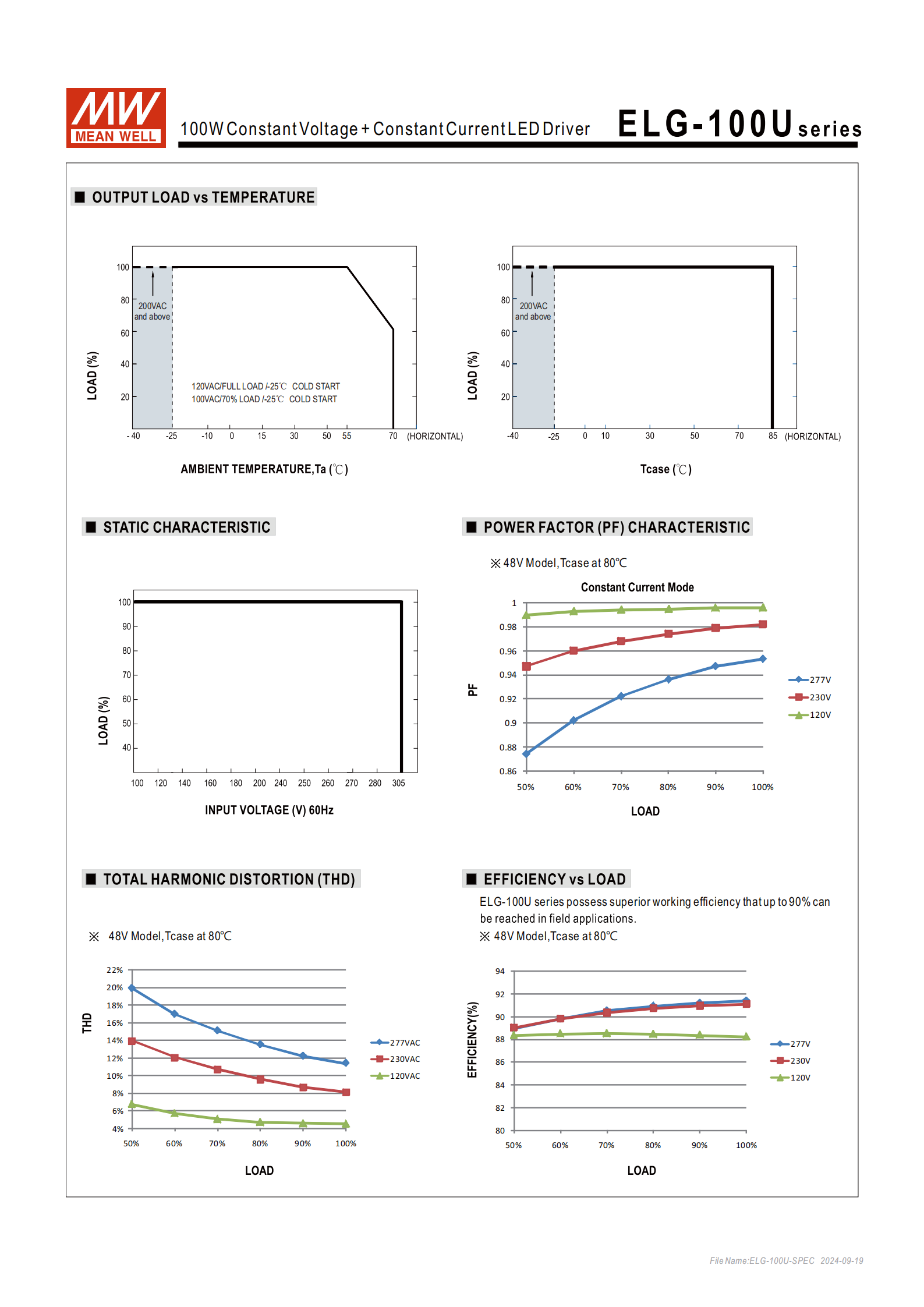 總諧波失真:THD<20%(負(fù)載≧50%/120VAC、≧60%/230VAC、≧75%/277VAC);