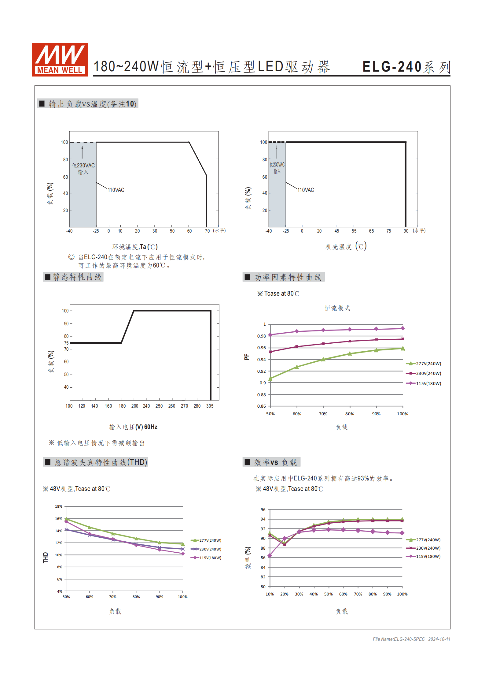 明緯 ELG-240 系列是180~240W 恒流 + 恒壓型 LED 驅(qū)動器,輸入電壓覆蓋100~305VAC/142~431VDC,輸出額定電壓有24/36/42/48/54V多款,具備IP65/IP67防護等級、93% 最高轉(zhuǎn)換效率,內(nèi)置主動式 PFC,空載 / 待機功耗 < 0.5W,壽命超50000 小時且提供5 年保固;支持三合一調(diào)光、DALI、智能定時調(diào)光等多種調(diào)光方式,金屬外殼接地設(shè)計,工作溫度為 **-40℃~+90℃**,適用于 LED 街道、建筑、天井燈等戶內(nèi)戶外照明,還可用于 Class I, Division 2 類危險地點照明。