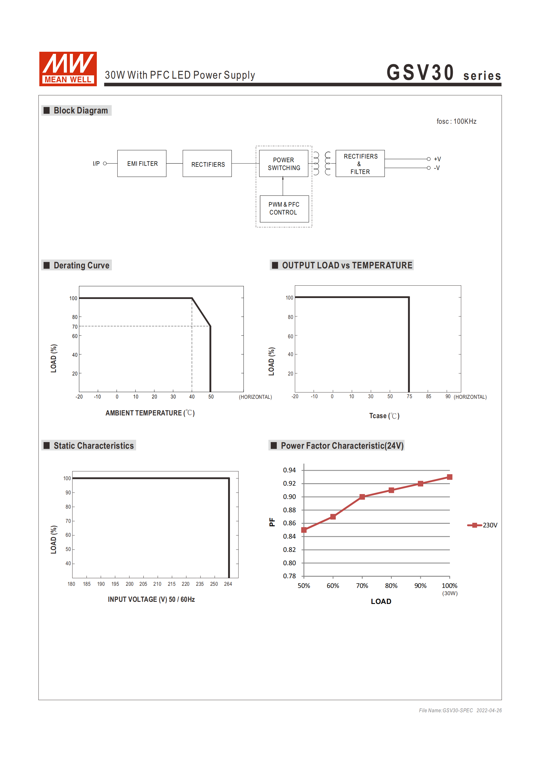 電氣輸入:交流輸入180~264VAC,頻率范圍47~63Hz,內(nèi)置主動式 PFC,功率因數(shù)性能優(yōu)異(24V 型號 230V 下負(fù)載 50% 及以上 PF≥0.80);