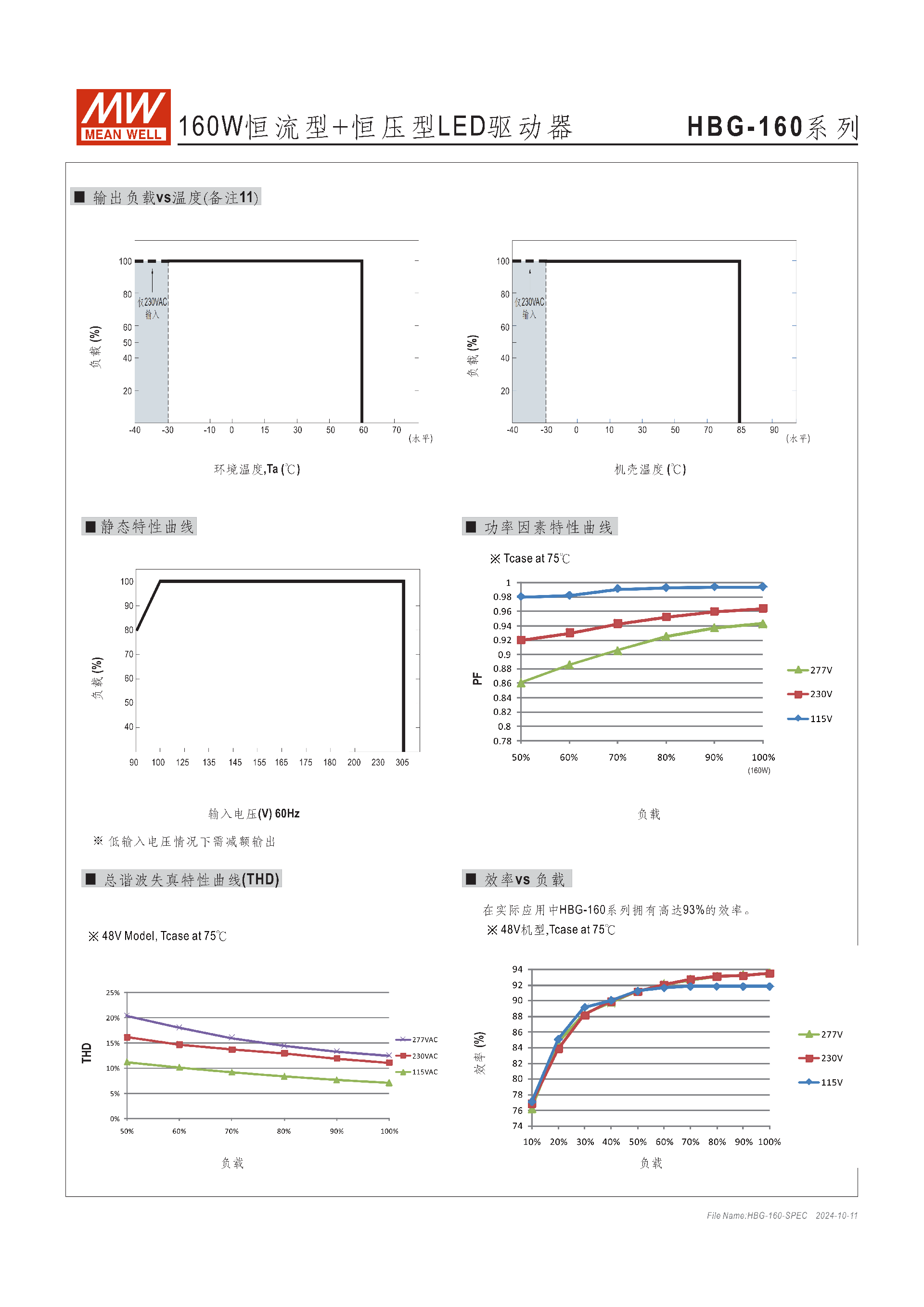 HBG-160 系列是明緯推出的160W 恒流 + 恒壓型 LED 驅(qū)動(dòng)器,采用金屬圓形外殼設(shè)計(jì),輸入電壓覆蓋90~305VAC,輸出額定電壓分24V/36V/48V/60V四檔,具備IP65/IP67高防護(hù)等級(jí),支持 **-40℃~+85℃寬溫工作,轉(zhuǎn)換效率最高達(dá)93.5%,擁有空白型、A/AB/B/DA 等多種型號(hào),分別適配固定電流、內(nèi)部電位器調(diào)流、三合一調(diào)光(1~10Vdc/10V PWM / 電阻)、DALI 控制等功能,內(nèi)置主動(dòng)式 PFC,功率因數(shù)最高≥0.98,具備過(guò)流 / 短路 / 過(guò)壓 / 過(guò)溫全方面保護(hù),MTBF 最高≥783.1K 小時(shí),壽命超50000 小時(shí)且提供5 年保固 **,戶內(nèi)戶外均可安裝,適配 LED 天井燈、射燈等多種燈具,還可用于 Class I, Division 2 類(lèi)危險(xiǎn)地點(diǎn)照明。