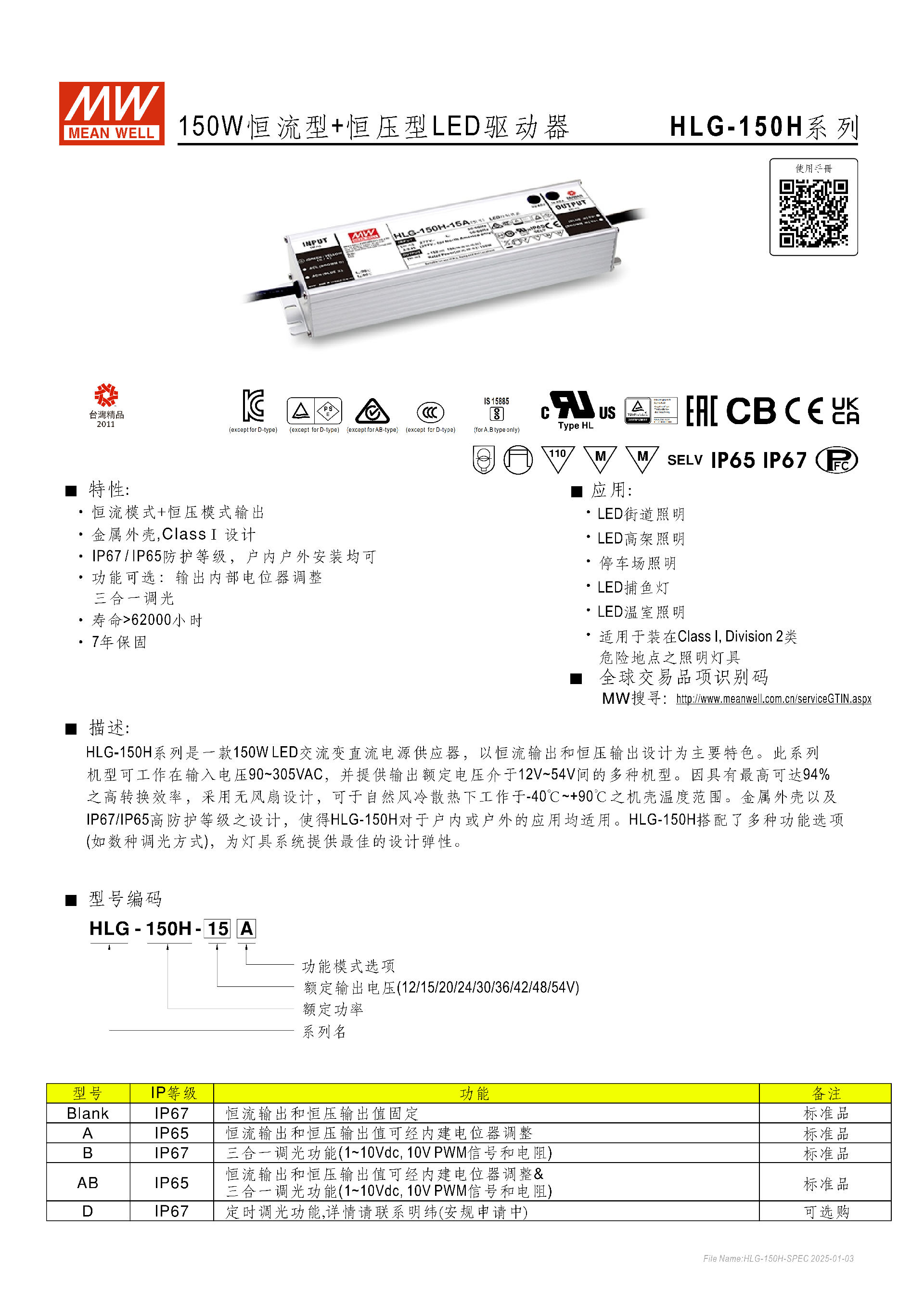 問題 1:HLG-150H 系列不同功能型號的 IP 防護(hù)等級和核心功能差異是什么,如何根據(jù)使用場景選型?