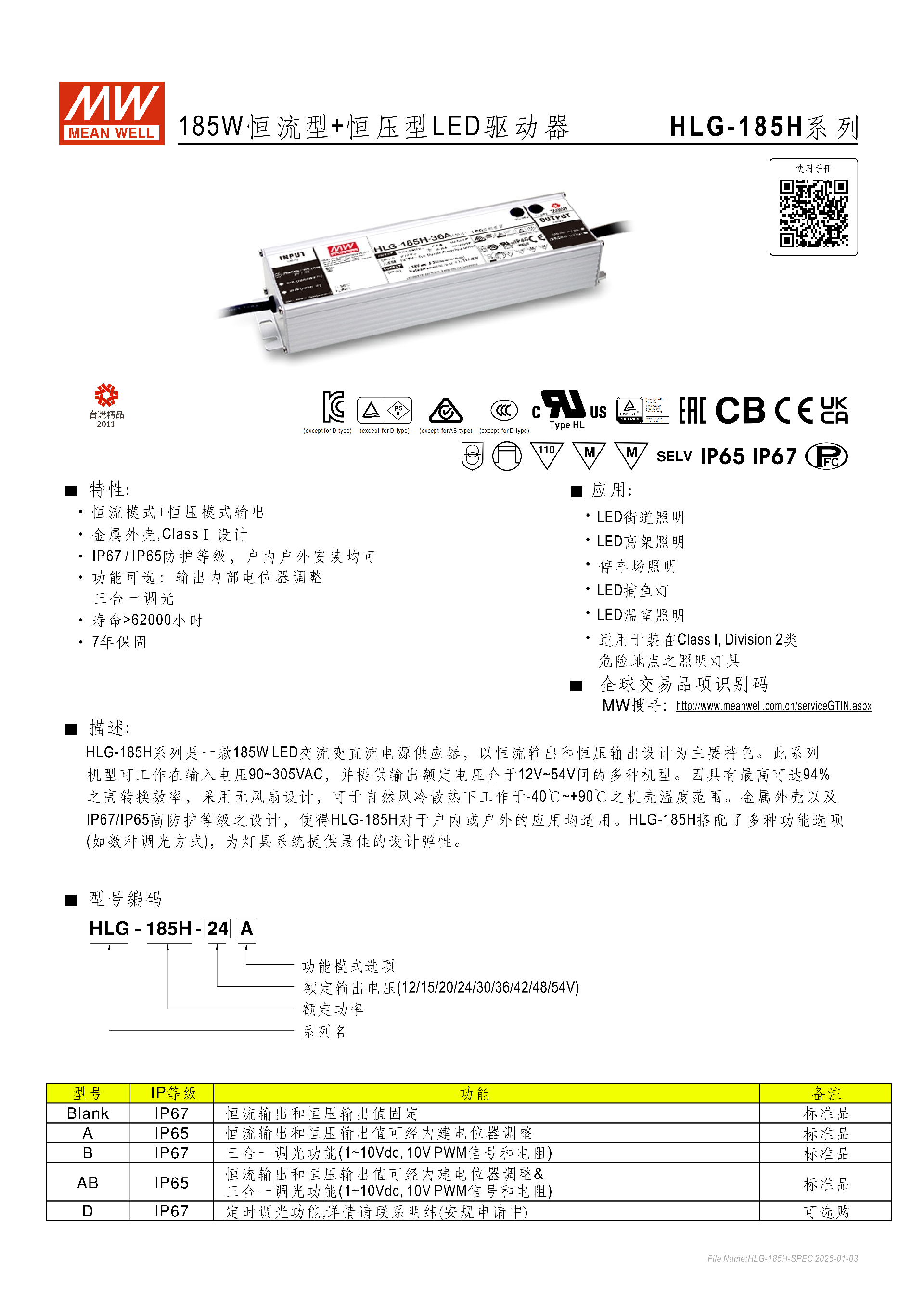 該系列核心型號(hào)按額定輸出電壓劃分,涵蓋 12V/15V/30V/36V/42V/48V/54V 共 7 檔,每檔電壓可搭配Blank/A/B/AB/D5 種功能模式(D 型為可選購(gòu),安規(guī)申請(qǐng)中),型號(hào)編碼規(guī)則為:HLG-185H-額定電壓-功能模式(例:HLG-185H-24A,24 為額定 24V,A 為功能模式)。