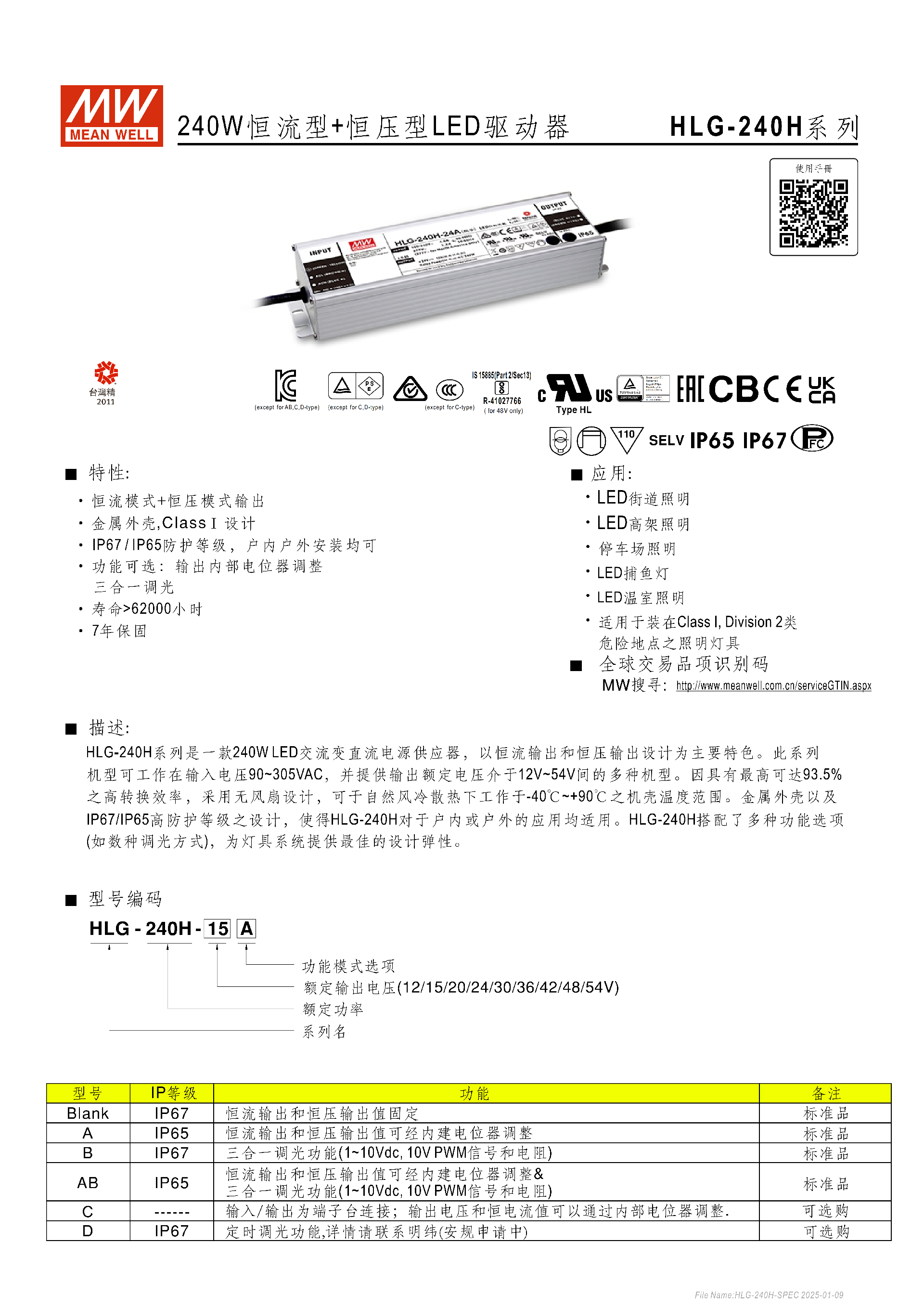 明緯HLG-240H 系列是 240W 恒流 + 恒壓型 LED 驅(qū)動(dòng)器,輸入電壓覆蓋90~305VAC,輸出額定電壓為12V~54V,具備IP65/IP67高防護(hù)等級(jí),金屬外殼設(shè)計(jì)適配戶(hù)內(nèi)戶(hù)外安裝,轉(zhuǎn)換效率最高達(dá)93.5%,無(wú)風(fēng)扇自然風(fēng)冷可在 **-40℃~+90℃機(jī)殼溫度工作,壽命超62000 小時(shí)且提供7 年保固 **;系列分 Blank、A、B 等多種型號(hào),支持內(nèi)部電位器調(diào)節(jié)、三合一調(diào)光(1~10Vdc/10V PWM / 電阻)等功能,適配 LED 街道、高架、捕魚(yú)燈等多種照明場(chǎng)景,還符合多項(xiàng)安規(guī)與電磁兼容標(biāo)準(zhǔn),具備過(guò)流、短路、過(guò)溫等完善的保護(hù)機(jī)制。