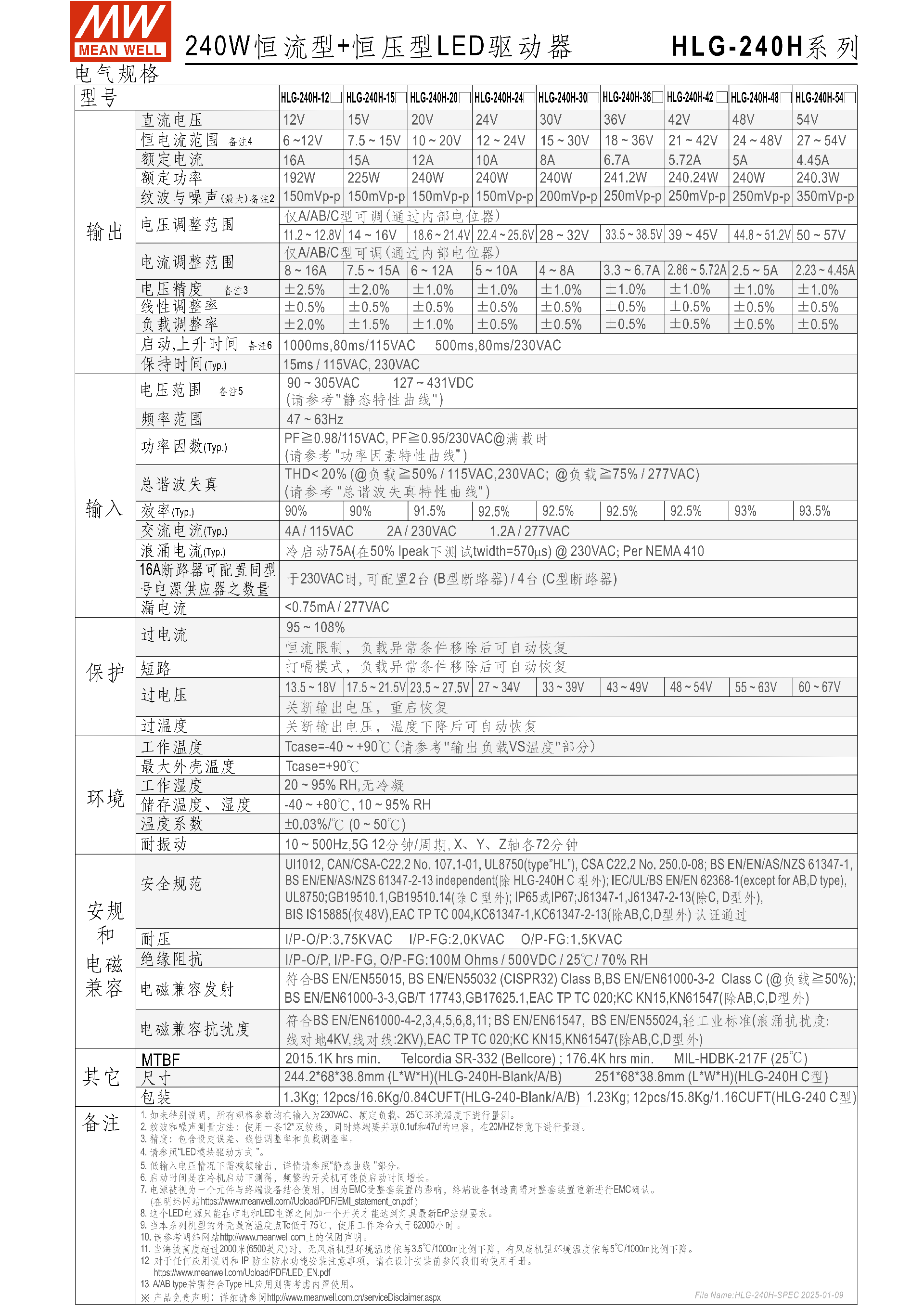 型號(hào) 額定電壓 額定電流 額定功率 最高轉(zhuǎn)換效率 紋波噪聲(最大) HLG-240H-12 12V 16A 192W 90% 150mVp-p HLG-240H-24 24V 10A 240W 92.5% 150mVp-p HLG-240H-48 48V 5A 240W 93% 250mVp-p HLG-240H-54 54V 4.45A 240.3W 93.5% 350mVp-p 電壓 / 電流調(diào)節(jié):僅 A/AB/C 型支持,通過(guò)內(nèi)部電位器實(shí)現(xiàn),如 12V 型號(hào)電壓調(diào)節(jié)范圍11.2~12.8V、電流8~16A;