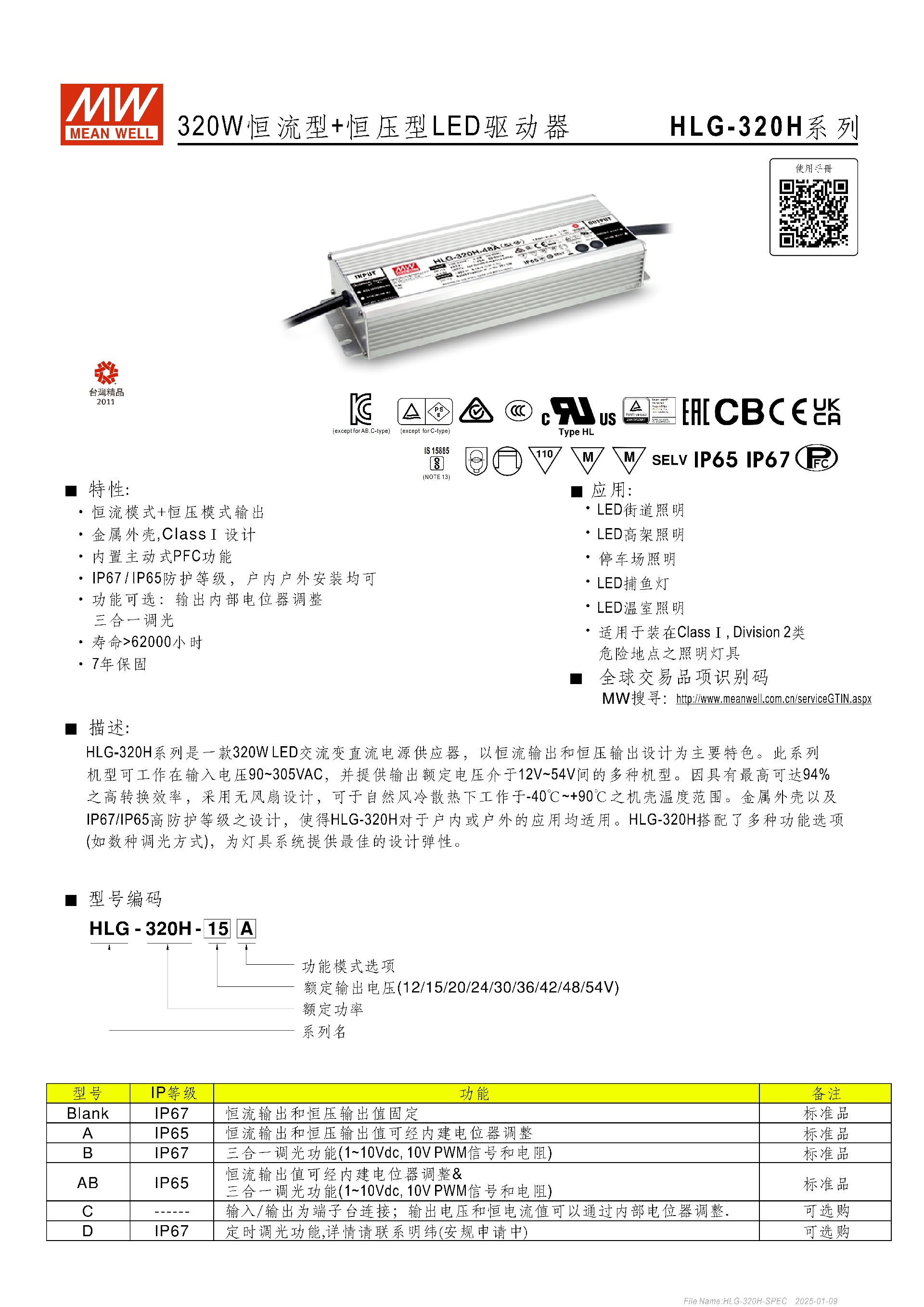 明緯HLG-320H 系列是 320W 恒流 + 恒壓型 LED 驅(qū)動器,輸入電壓覆蓋90~305VAC,輸出額定電壓為12V~54V多檔位,具備IP65/IP67防護等級,轉(zhuǎn)換效率最高達94.5%,工作溫度為 **-40℃~+90℃機殼溫度,擁有恒流 / 恒壓雙驅(qū)動模式,提供 Blank/A/B/AB/C/D 六種功能型號,支持三合一調(diào)光(B/AB 型)、電壓 / 電流內(nèi)部電位器調(diào)節(jié)(A/AB/C 型)等功能,內(nèi)置主動式 PFC,防護功能完善,壽命超62000 小時且提供7 年保固 **,適用于街道、高架、停車場等多種戶內(nèi)外 LED 照明場景。
