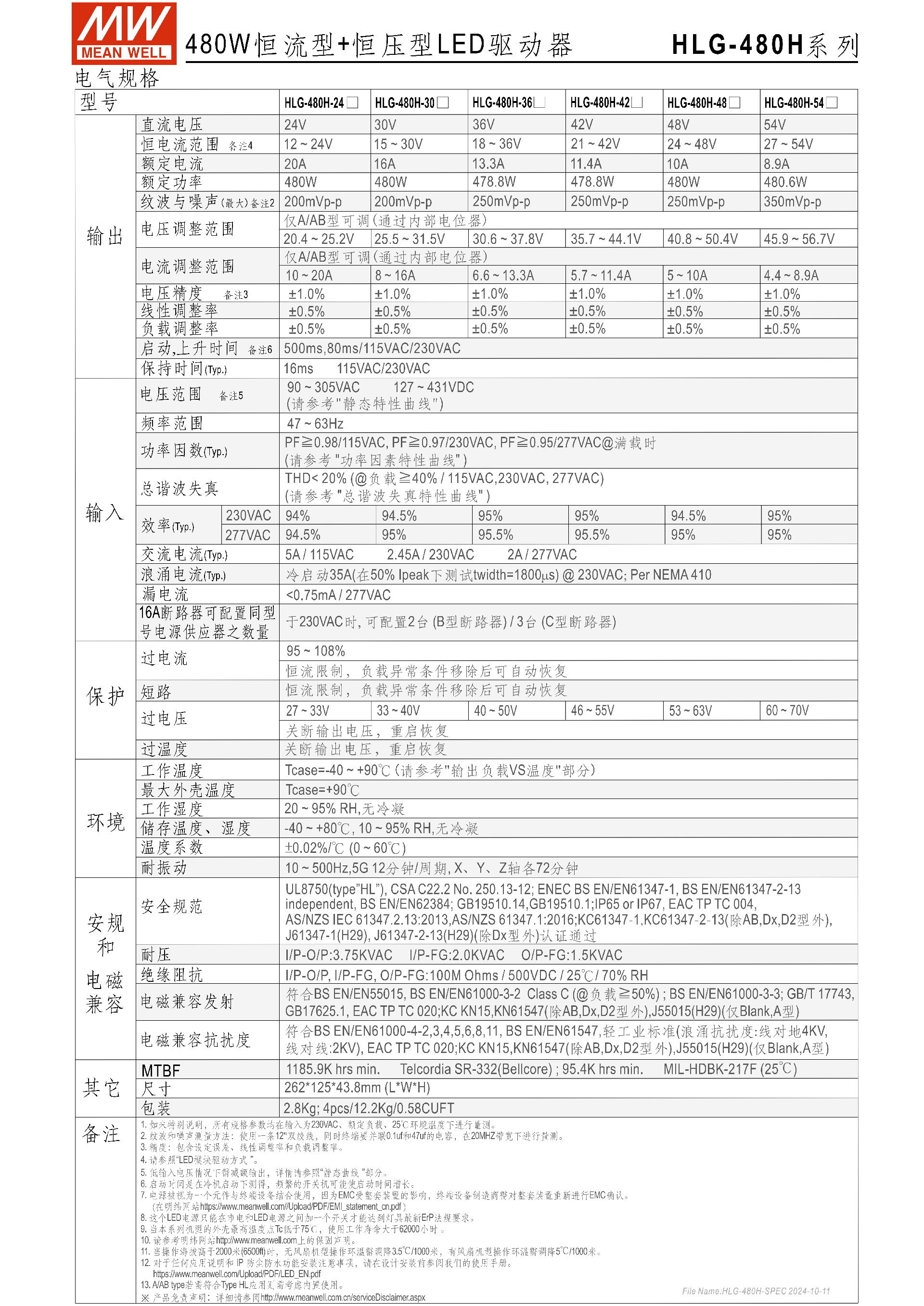 HLG-480H-24、HLG-480H-30、HLG-480H-36、HLG-480H-42、HLG-480H-48、HLG-480H-54每款基礎電壓可搭配所有功能后綴,形成完整型號(如 HLG-480H-24A、HLG-480H-36B、HLG-480H-54D2 等)。