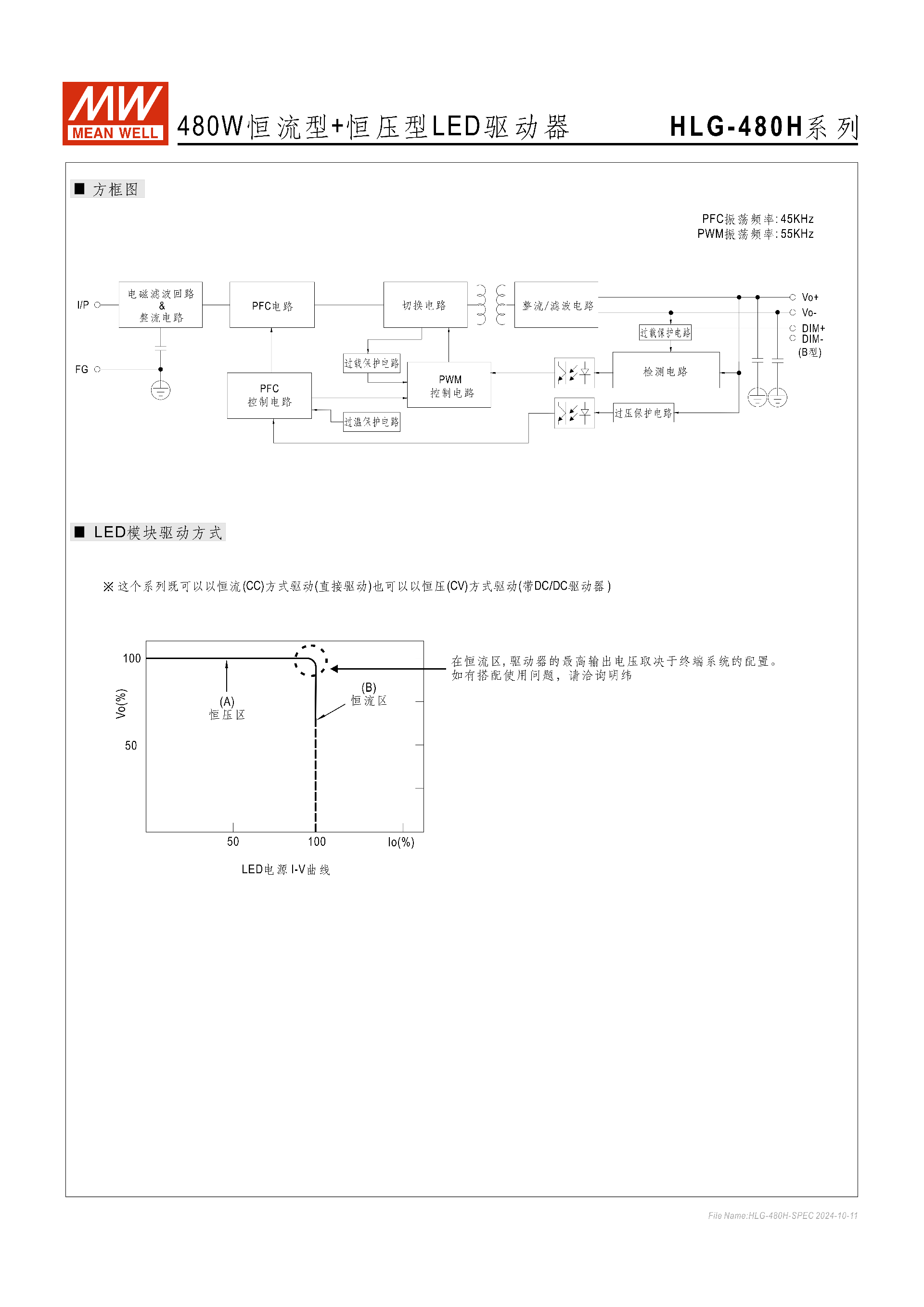 HLG-480H 系列是明緯推出的480W恒流 + 恒壓雙模式 LED 交流轉直流驅動器,為戶內戶外通用型產品,核心特性如下: