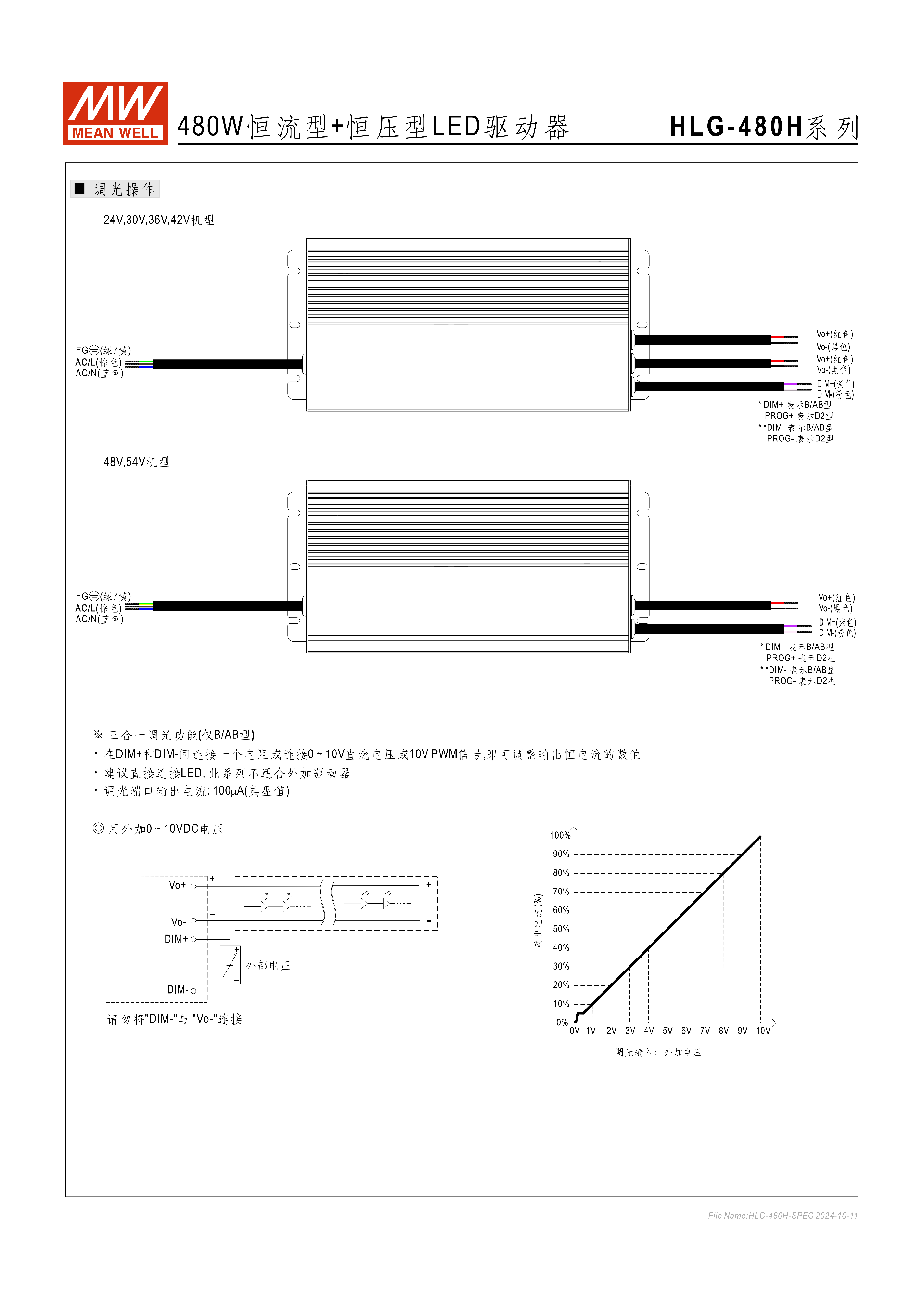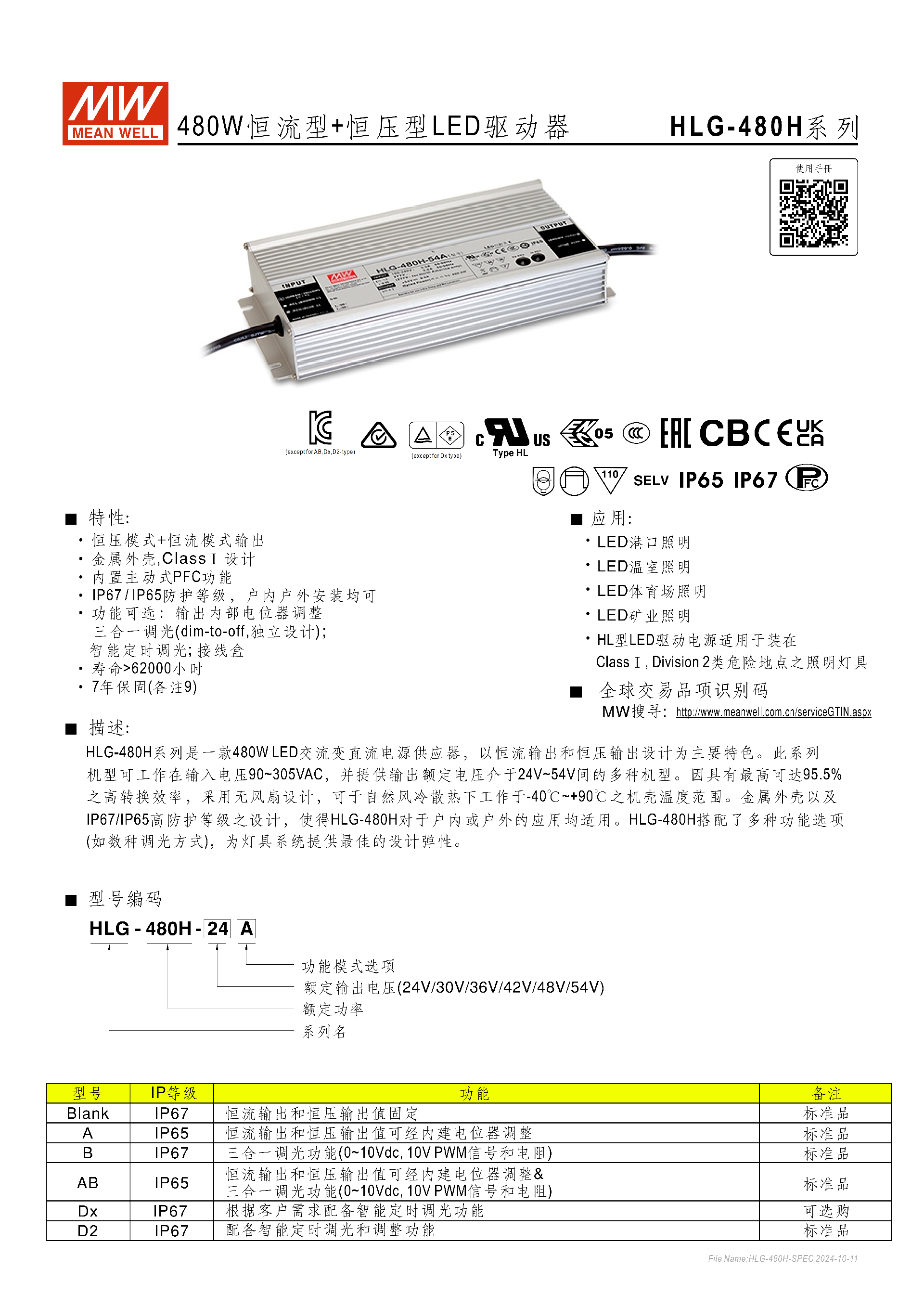 HLG-480H-24、HLG-480H-30、HLG-480H-36、HLG-480H-42、HLG-480H-48、HLG-480H-54每款基礎電壓可搭配所有功能后綴,形成完整型號(如 HLG-480H-24A、HLG-480H-36B、HLG-480H-54D2 等)。