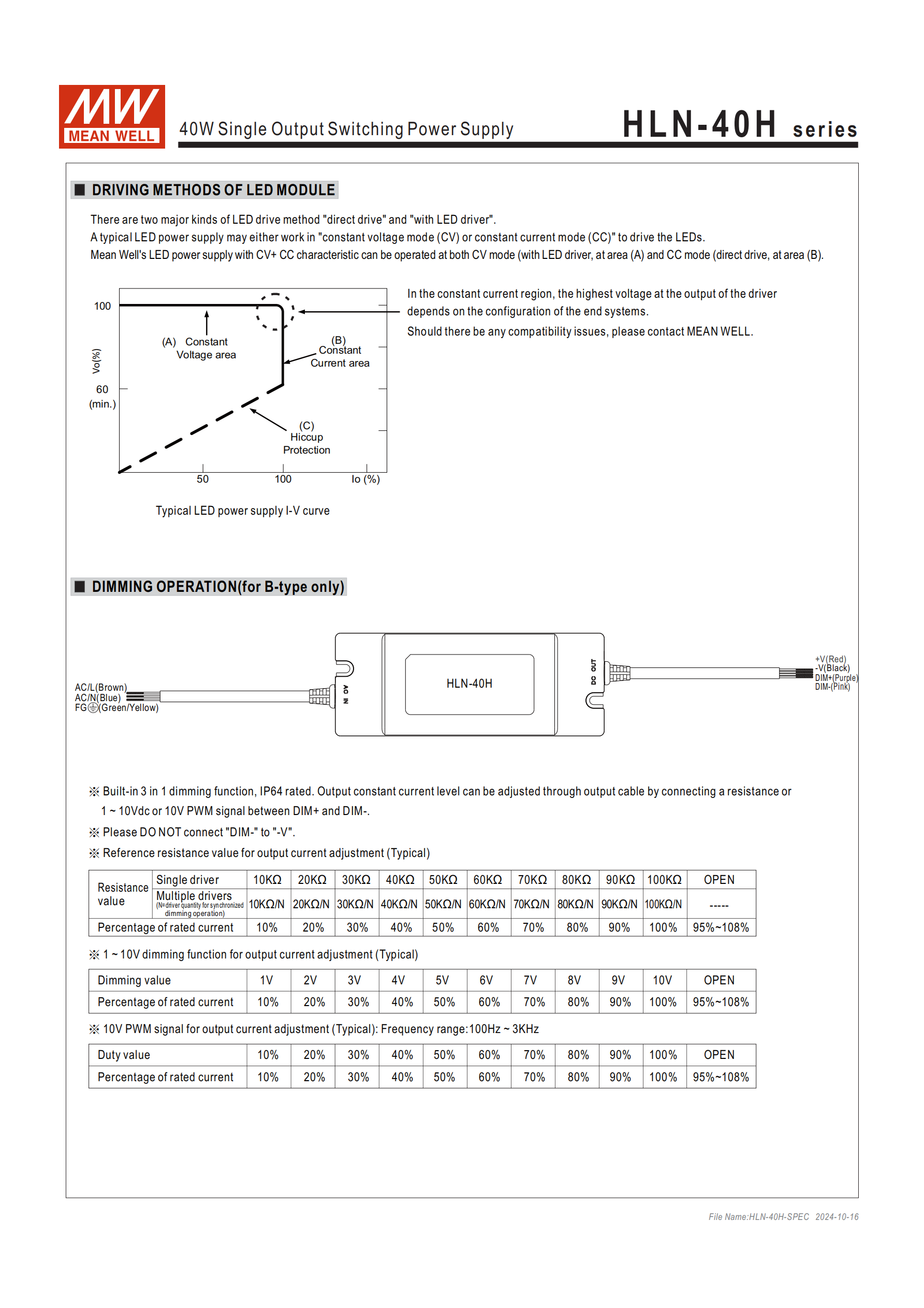 4. 特殊情況:DIM + 與 DIM - 開路時,電流為額定值的 95%~108%,且禁止將 DIM - 與 - V 連接。