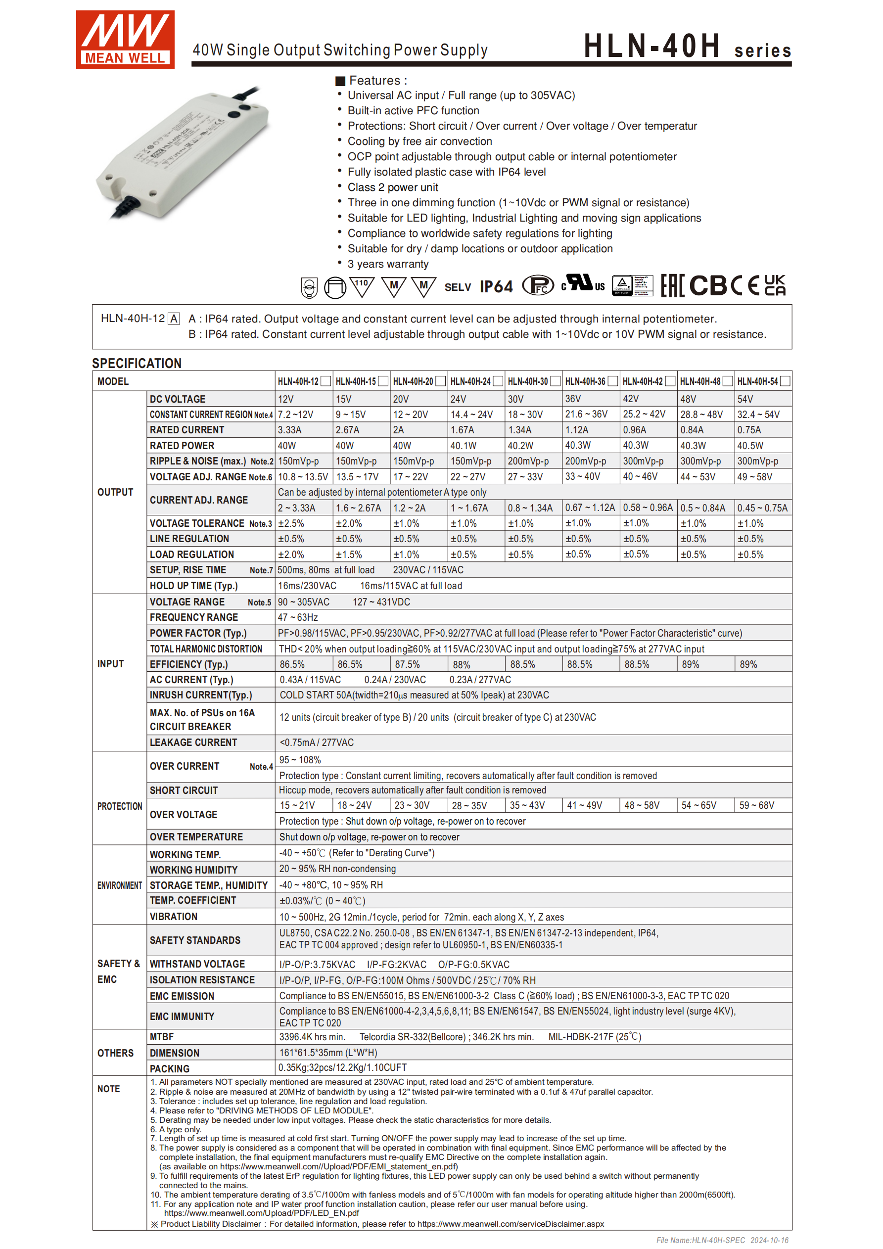 | HLN-40H-54 | 54V | 0.75A | 40.5W | 300mVp-p | 0.45~0.75A |