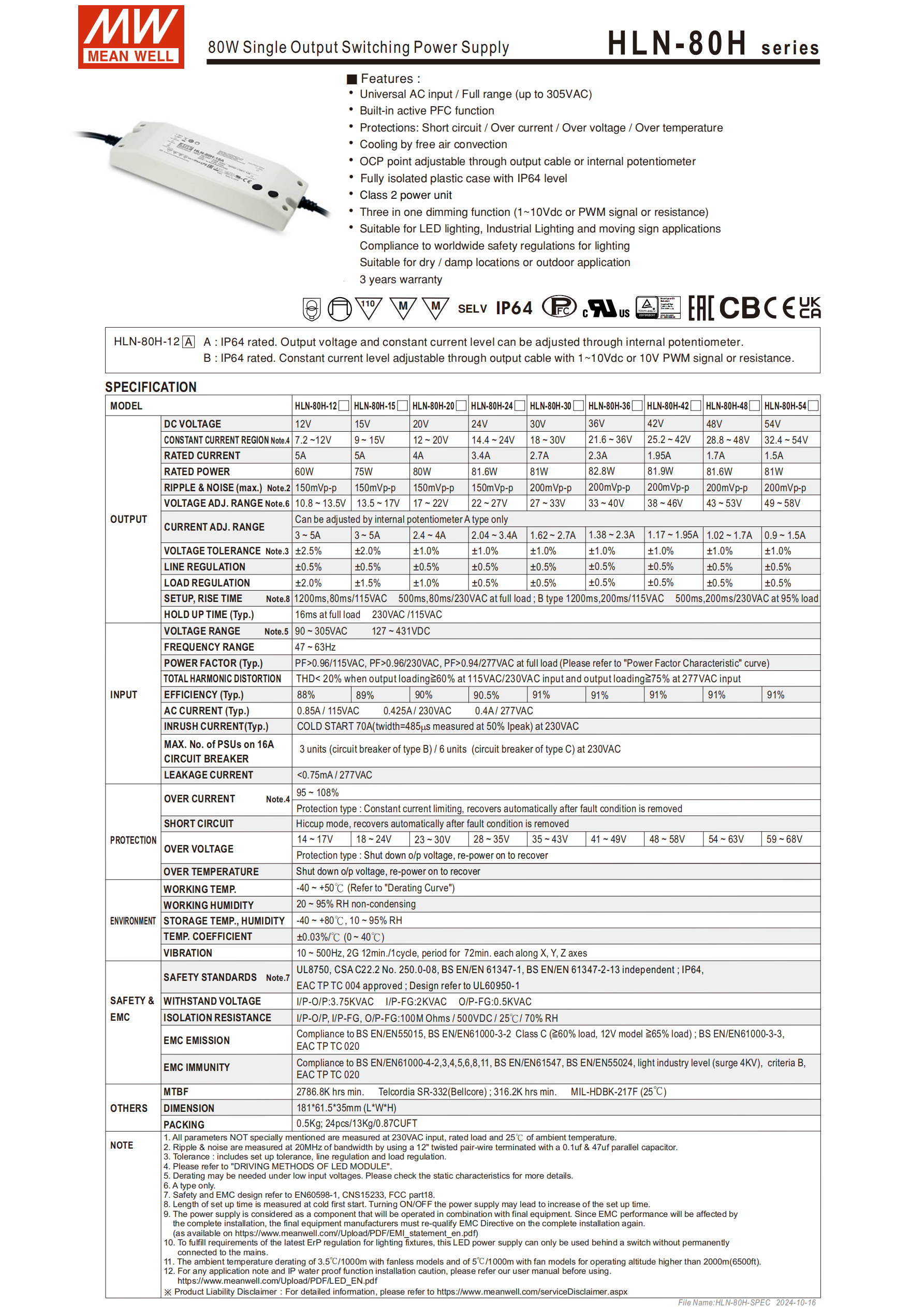 HLN-80H 系列是明緯推出的 80W 單組輸出開關(guān)電源,具備IP64 密封塑膠外殼、主動式 PFC功能,交流輸入范圍達90~305VAC,支持 **-40~+50℃寬溫工作,分A 型 **(內(nèi)部電位器調(diào)電壓 / 電流)和B 型(1~10Vdc/PWM/ 電阻調(diào)光),擁有短路 / 過流 / 過壓 / 過溫四重保護,Class 2 電源等級,符合全球照明安全規(guī)范,適配 LED 照明、工業(yè)照明等場景,提供3 年保固,MTBF 值最高達2786.8K hrs,效率最高91%。
