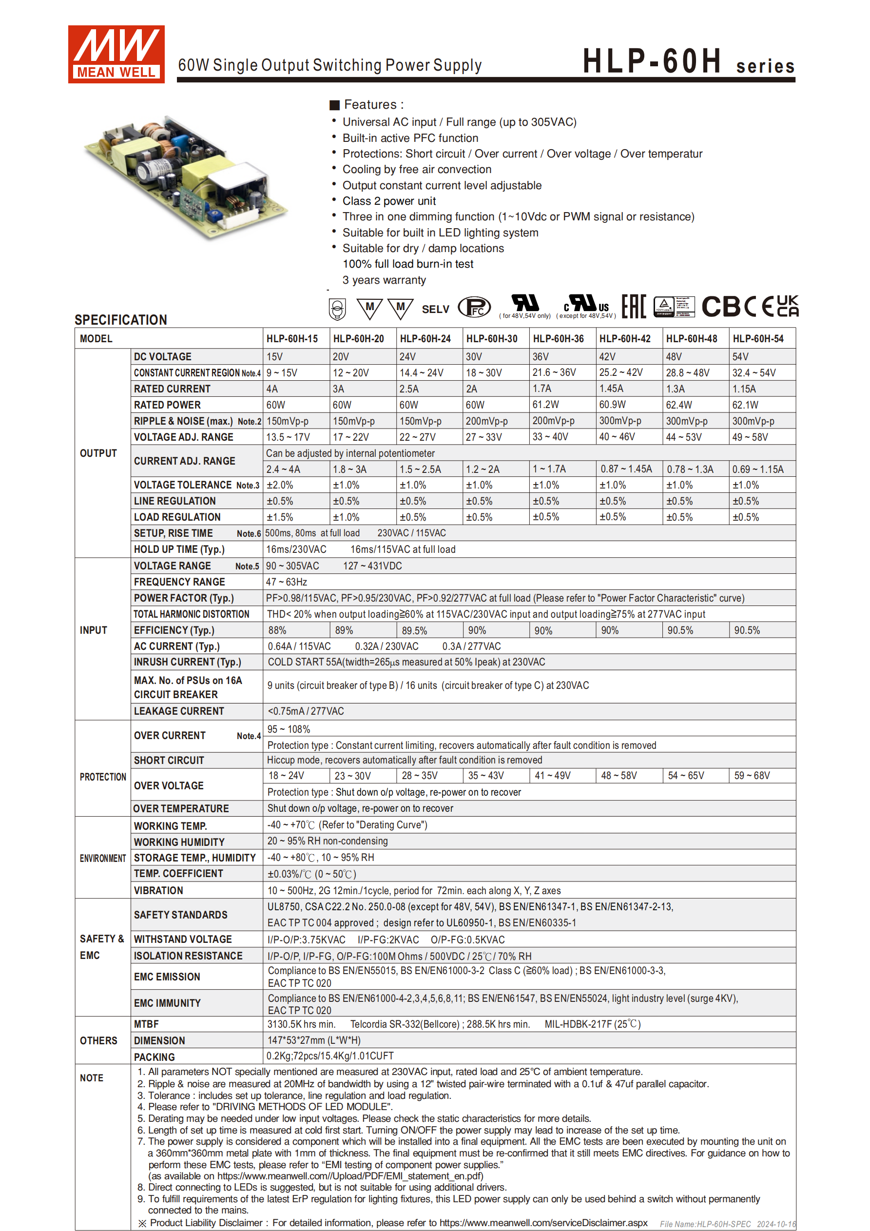 | HLP-60H-24 | 24 | 2.5 | 60 | 14.4~24 | 22~27 | 1.5~2.5 | 150 | ±1.0% |