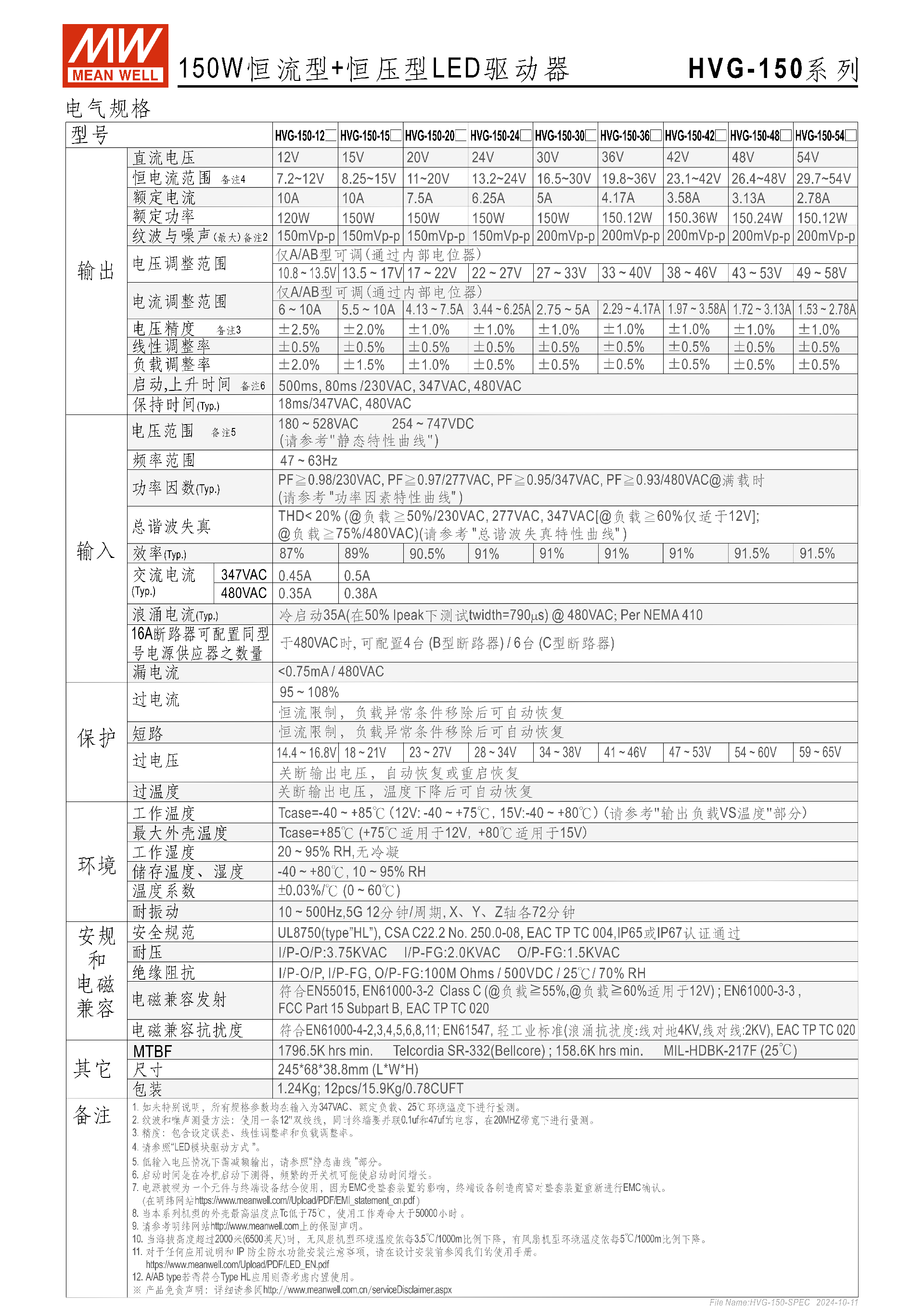 明緯HVG-150 系列是 150W 恒流 + 恒壓型 LED 驅(qū)動器,具備180~528VAC 寬輸入電壓,輸出額定電壓覆蓋 12V~54V 多檔位,擁有IP65/IP67 高防護(hù)等級,金屬外殼無風(fēng)扇設(shè)計可在 - 40℃~+80℃機(jī)殼溫度工作,轉(zhuǎn)換效率最高達(dá)91.5%;該系列分 A/B/AB/D 四種功能型號,支持內(nèi)部電位器調(diào)節(jié)、三合一調(diào)光(0~10Vdc/10V PWM / 電阻)等功能,部分型號可選智能定時調(diào)光,內(nèi)置主動式 PFC,防護(hù)功能完善,MTBF 壽命優(yōu)異,適配 LED 街道、高架、溫室等多種照明場景,還可用于 Class I, Division 2 類危險地點(diǎn)照明,提供5 年保固,物理尺寸為 2456838.8mm,支持戶內(nèi)戶外安裝及多種防水接頭、接線配件選配。